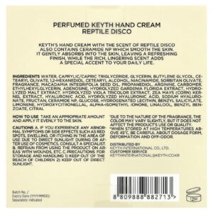 O creme para as mãos da Keyth com perfume de Reptile Disco também contém ceramida NP, que suaviza a pele. É absorvido suavemente pela pele, deixando um acabamento refrescante. O perfume rico e duradouro adiciona um toque especial à sua vida diária.