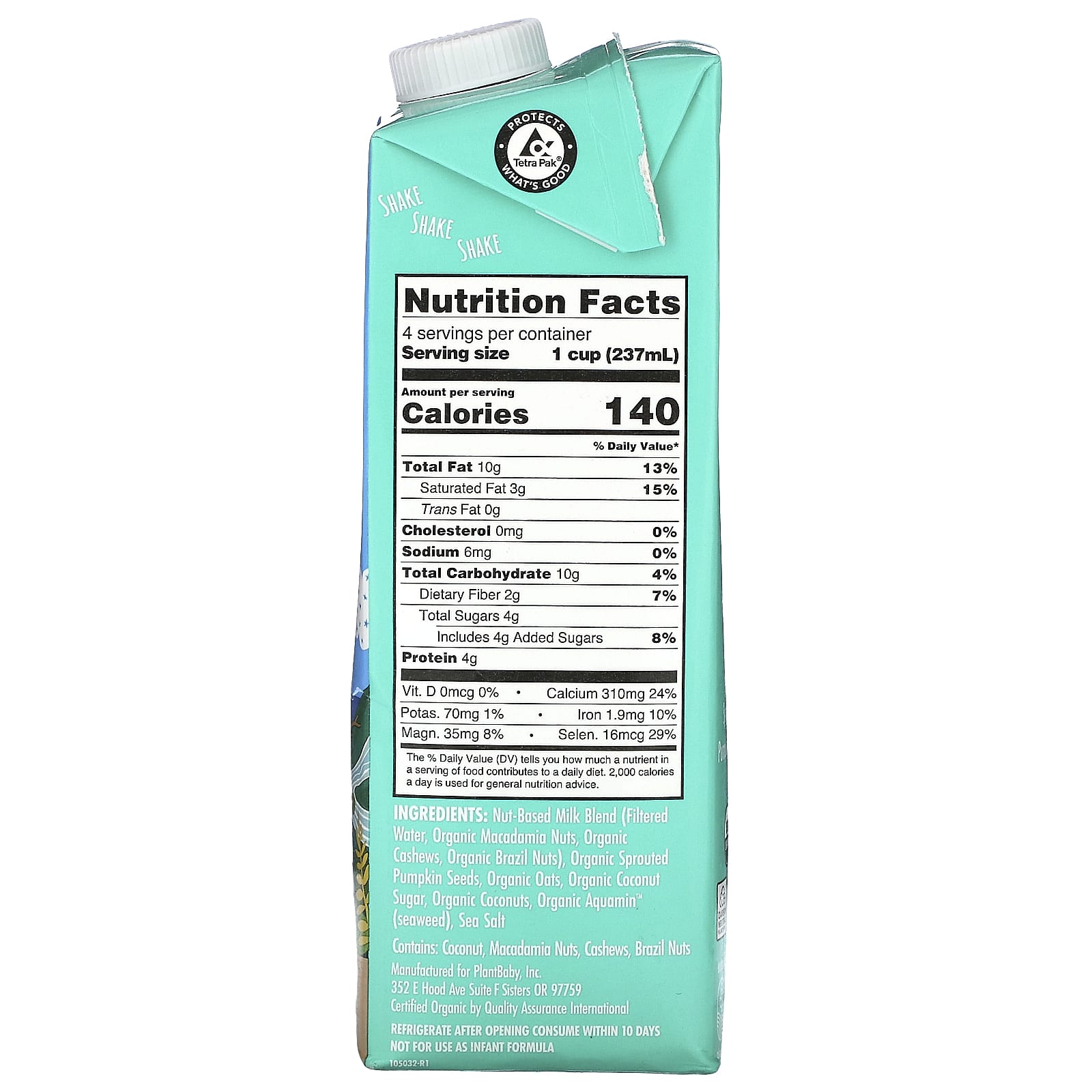 Mistura de leite à base de frutos secos (água filtrada, nozes de macadâmia orgânica, cajus orgânicos, castanha-do-pará orgânica), sementes germinadas de abóbora orgânica, aveia orgânica, açúcar de coco orgânico, cocos orgânicos, Aquamin ™ orgânico (alga marinha), sal marinho.