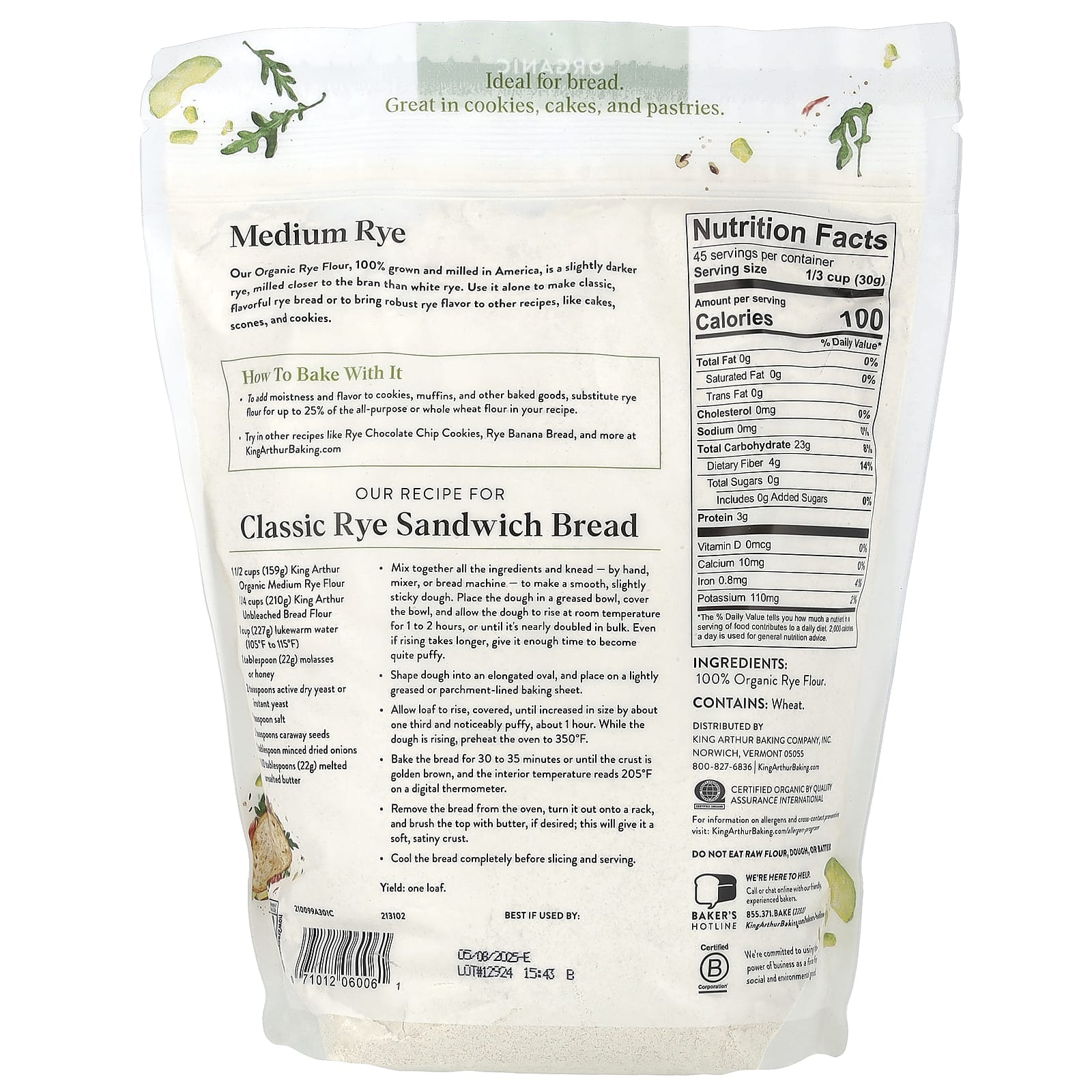 Nossa Farinha de Centeio Orgânica, 100% cultivada e moída na América, é um centeio um pouco mais escuro, moído mais próximo do farelo do que o centeio branco. Use-o sozinho para fazer o pão de centeio clássico e saboroso ou para adicionar um sabor forte de centeio a outras receitas, como bolos, scones e biscoitos.