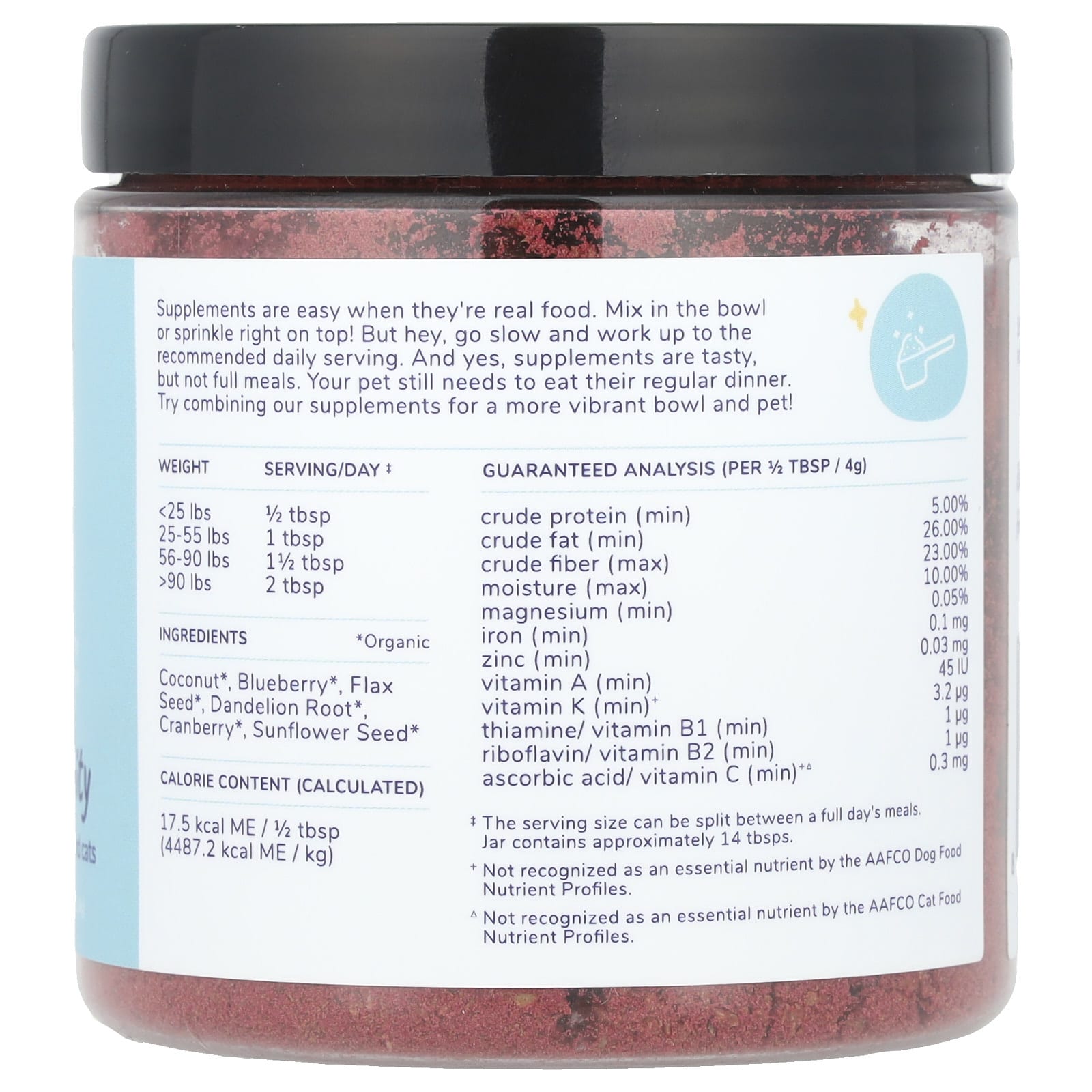 Os suplementos são fáceis quando são alimentos de verdade. Misture na tigela ou polvilhe por cima! Mas, ei, vá devagar e aumente a dose diária recomendada. E, sim, os suplementos são saborosos, mas não são refeições completas. Seu animal de estimação ainda precisa comer o jantar normal.