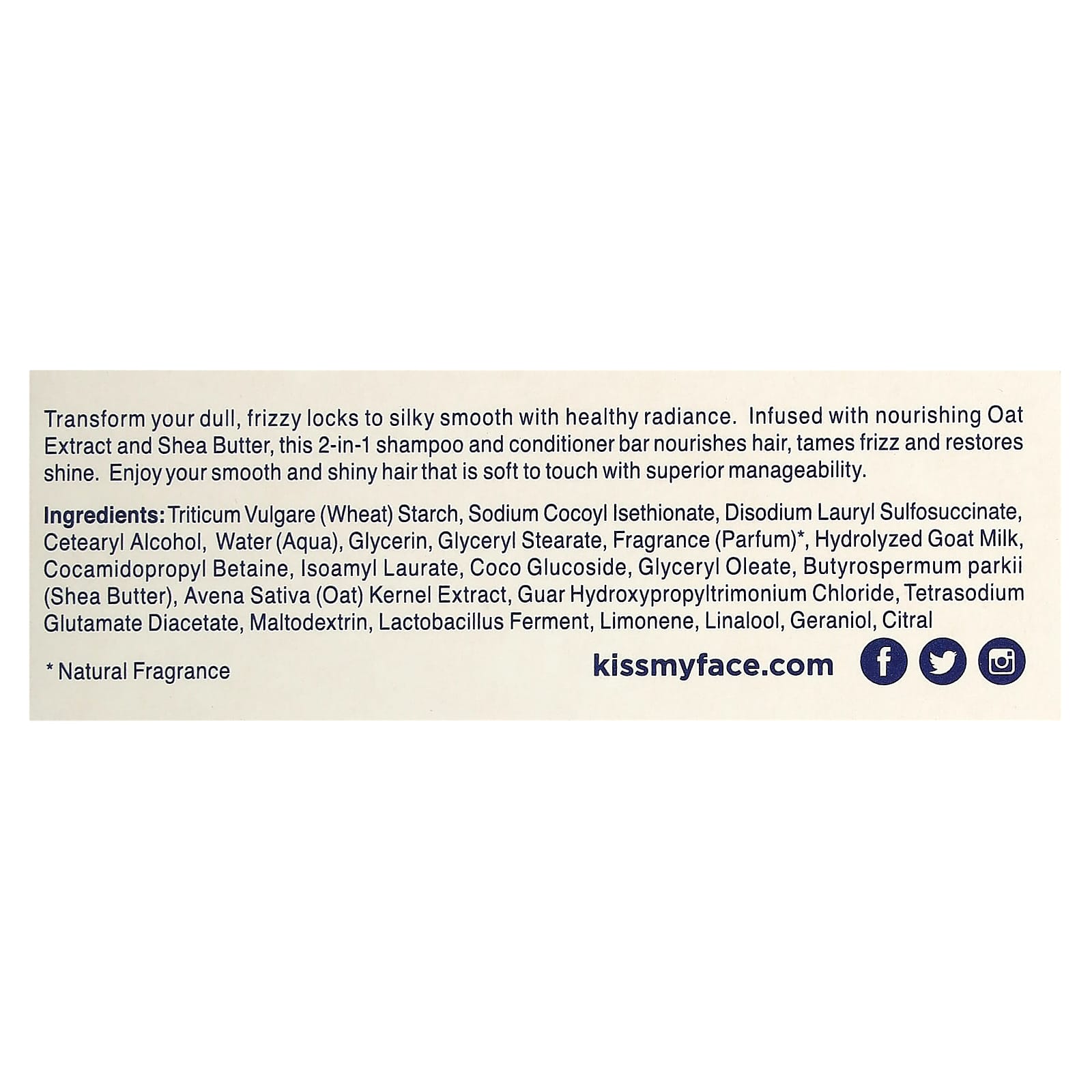 Kiss My Face Barra 2 em 1 para Nutrição Shampoo e Condicionador Para Cabelos Secos Opacos e Frisados Aveia e Manteiga de Karité 1 Barra 113 g (4 oz) – Kiss My Face Cuidados Pessoais Cabelos Shampoo Shampoos em Barra Condicionador.