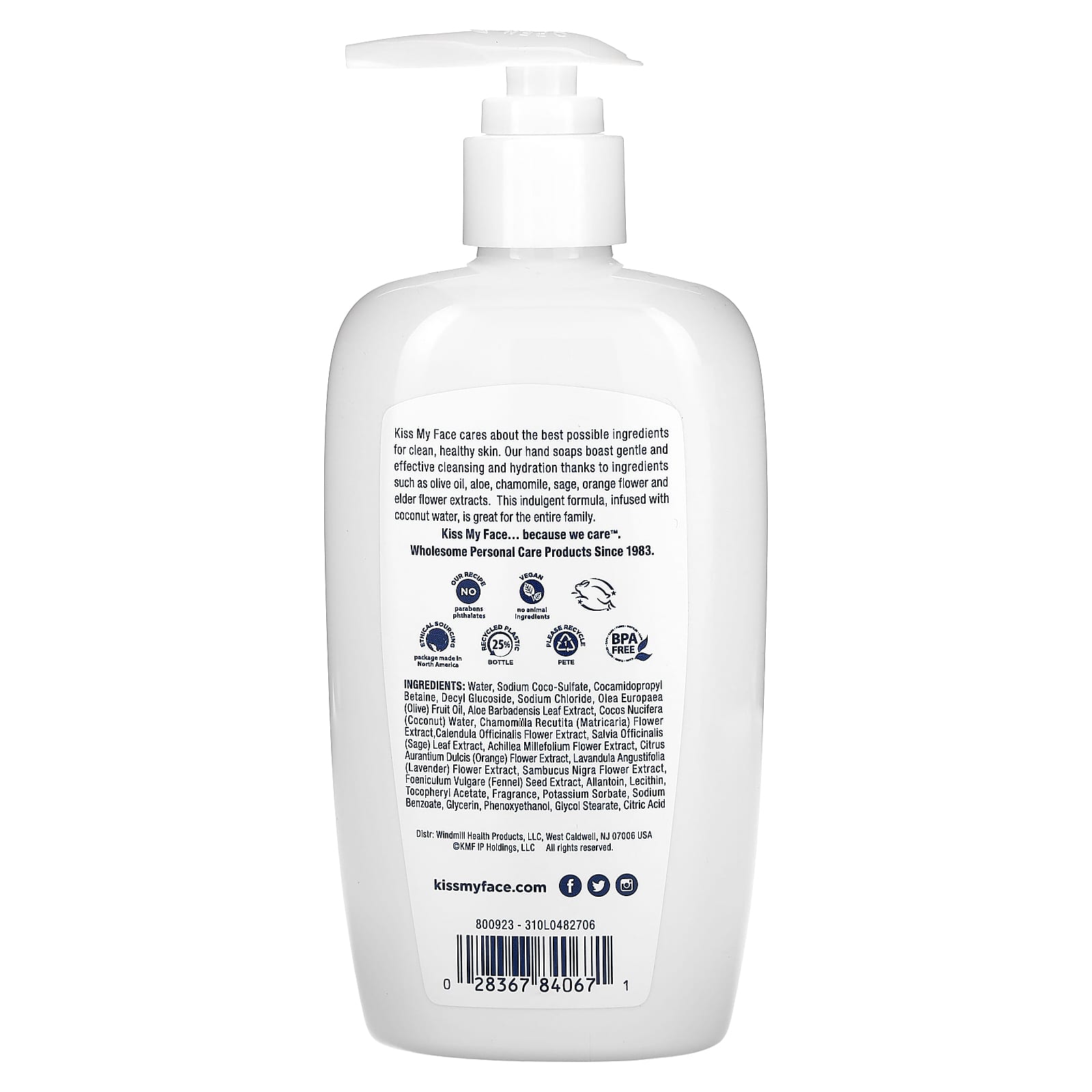 A Kiss My Face se preocupa com os melhores ingredientes possíveis para uma pele limpa e saudável. Nossos sabonetes para as mãos oferecem limpeza e hidratação suaves e eficazes graças aos ingredientes como óleo de oliva, aloe, camomila, sálvia, flor de laranjeira e extratos da flor de sabugueiro. Esta fórmula suave, infundida com água de coco, é ótima para toda a família.
