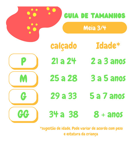 R: Deixamos os tamanhos bem especificados, tanto a numeração do calçado como a idade da criança na ultima foto do anuncio. Recomendamos sempre comprar um tamanho um pouquinho maior tanto para maior conforto quanto porque a criança cresce rápido geralmente.
