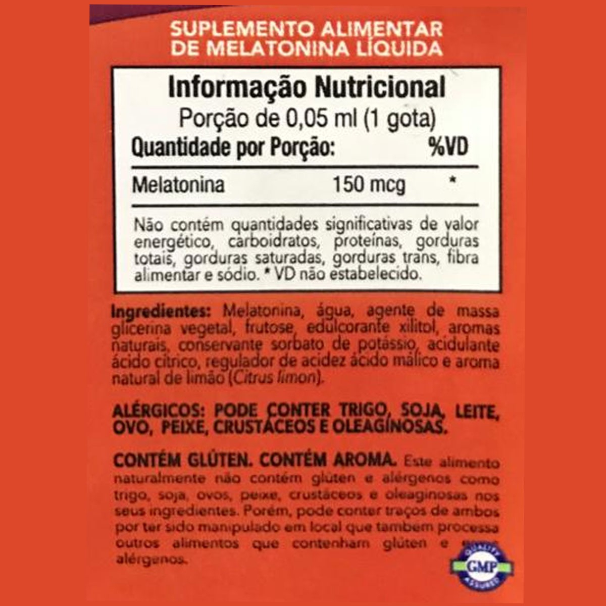 Melatonina, água, agente de massa glicerina vegetal, frutose, edulcorante xilitol, aromas naturais, conservante sorbato de potássio, acidulanteácido cítrico, regulador de acidez ácido málico e aroma natural de limão (Citrus limon).