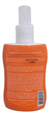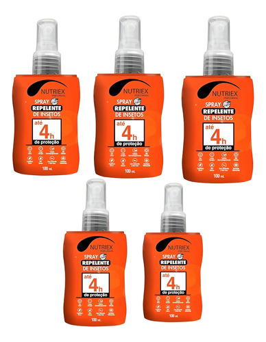 KIT CONTÉM 5 UNIDADES DE 100 ML Spray repelente de insetos nutriex profissional 4H. Contém 1 frasco de spray repelente de insetos que proporciona até 4 horas de proteção contra os mosquitos. Marca: Nutriex. Uso: diário. Tecnologia: oil free (livre de óleo). Repelente de insetos: Grau 2 DESCRIÇÃO Desenvolvido com estratos de camomila e aloe vera, o spray repelente de insetos profissional proporciona proteção de até 4 horas contra os mosquitos Aeges aegypti (Dengue, Frebre Amarela, Chikungunya e Zika), Anopheles sp (Malária) e Culex Quinquefasciatus (mosquito doméstico) sem ressecar a pele. Produto dermatologicamente testado, desenvolvido com tecnologia oil free que não deixa aspecto oleoso, possui fragrância suave e rápida absorção. APLIACAÇÕES Aplicar uniformemente nas áreas expostas que deseja proteger. Não utilizar se a pele estiver irritada ou lesionada. Para aplicar no rosto, aplique primeiramente o produto nas mãos e a seguir leve ao rosto, lavar as mãos com água e sabão após o uso e reaplicar a cada 4 horas. Não aplicar na região dos olhos, boca ou mucosas (Caso ocorra, lavar com água em abundância). PRECAUÇÕES Conservar o produto longe do alcance de crianças e animais. Para uso durante a gravidez e amamentação, consulte um médico. Não aplicar em crianças menores de 2 (dois) anos de idade. INFORMAÇÕES ADICIONAIS Espalha com facilidade. Possui extratos de camomila e aloe vera. Fragrância suave. Evita o ressecamento da pele Composição isenta de ingredientes perigosos à saúde. ATENÇÃO: Produto sujeito a variações de cor devido às características naturais do material e ao padrão de visualização em diferentes telas. Imagem ilustrativa. Podem haver variações nas cores e design do produto. Garantia do vendedor: 7 dias