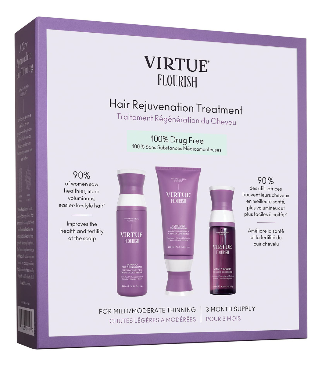 O Flourish Hair Rejuvenation Treatment é um regime de base botânica 100% livre de medicamentos para ajudar no crescimento do cabelo. Esse sistema de três etapas foi projetado para alimentar folículos fatigados, nutrir o couro cabeludo e engrossar o cabelo mecha por mecha. Este kit inclui shampoo e condicionador Flourish para cabelos finos e o Density Booster Flourish, sem medicamentos. Esse regime é ideal para emagrecedores leves a moderados e para aqueles que buscam uma solução mais natural. Alimentados por duas proteínas de queratina inovadoras, os produtos Flourish limpam, purificam e enriquecem o couro cabeludo, criando um terreno fértil para um novo crescimento. À medida que cada novo cabelo surge, ele é nutrido e fortalecido, reduzindo a taxa de quebra e ajudando o cabelo a crescer até a maturidade. – Ideal para queda de cabelo leve a moderada – O sistema de três etapas contém: xampu para cabelos ralos, condicionador Flourish para cabelos ralos, intensificador de densidade Flourish – A fragrância é uma mistura suave de ervas aromáticas, frutas cítricas brilhantes, flores limpas e madeiras equilibradas, com manjericão e óleos essenciais de patchouli para cuidar do couro cabeludo e cabelos saudáveis. – Para obter melhores resultados, continue o regime por até 12 semanas