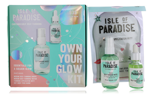Este conjunto inclui gotas autobronzeadoras de 1 onça, água autobronzeadora de 3,38 onças e uma luva aplicadora de bronzeamento.