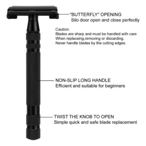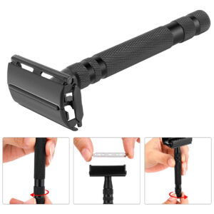 O pacote inclui: 1 peça de suporte de barbear +1 peça de barbear +1 peça de tigela de barbear +1 peça de escova de barbear +1 caixa de lâminas superinoxidáveis (10 peças) – Os misteriosos conjuntos de barbear e higiene masculinos negros são modernos e artísticos em qualquer banheiro. O lindo kit de barbear vem com 5 ferramentas essenciais em uma elegante caixa de presente preta. Seu acabamento requintado o torna um kit exclusivo e luxuoso que você não deve perder! – Toda esta navalha é feita de latão premium com um misterioso acabamento preto fosco. Nunca se preocupe com a ferrugem, mesmo em ambientes úmidos. Peso líquido da navalha: 100g, medida: 11 cm de comprimento total. – É uma escova de barbear de nylon 100% sintético. Se você não gosta do cheiro de cabelo de texugo, esta é a boa escolha. Nenhum animal foi ferido por causa dos materiais da escova. Perfeita para barbear com água úmida, retém água e suaviza as cerdas da barba para um barbear úmido perfeito e verdadeiro. A alça da escova é feita com um revestimento emborrachado de baixo deslizamento para que as mãos se sintam bem. – A tigela de barbear de aço inoxidável de dupla camada de tamanho padrão mantém o calor da água quente, permitindo que a escova fique de molho e aqueça, ajudando a gerar uma espuma mais rica e meticulosa. Projetamos um tamanho adequado para um manuseio firme para evitar derrapagens acidentais. A superfície revestida de preto fosco evita ferrugem, é fácil de limpar. – Ótimo presente: o lindo conjunto de barbear e higiene é perfeito para qualquer coleção de barbear masculina e ficará ótimo em seu banheiro. Se você está procurando um conjunto de barbear como presente para pai, irmão, namorado ou marido, este será a escolha ideal!