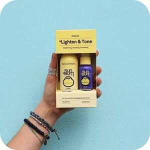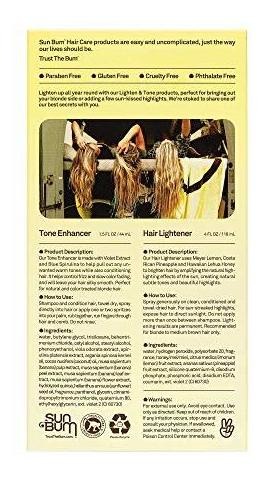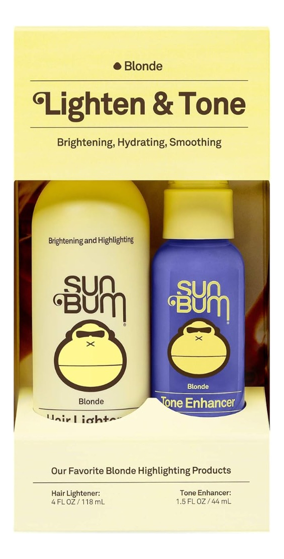 The Sun Bum Blonde Lighten & Tone Kit is designed to enhance the color and shine of blonde hair, providing sun-kissed highlights. The set includes a hair lightener and a tone enhancer that work together to brighten and tone your hair. The products are enriched with natural ingredients like Costa Rican Pineapples, Hawaiian Lehua Honey, and Meyer Lemon. Its also infused with nourishing elements like Violet Extract, Blue Spirulina, and Argan Oil. The lightener is heat-activated, perfect for use under the sun or with a hairdryer, and the tone enhancer is used after shampooing for added shine and color refinement. Content: 1 Hair lighten 118ml & 1 Tone Enhancer 44ml.
