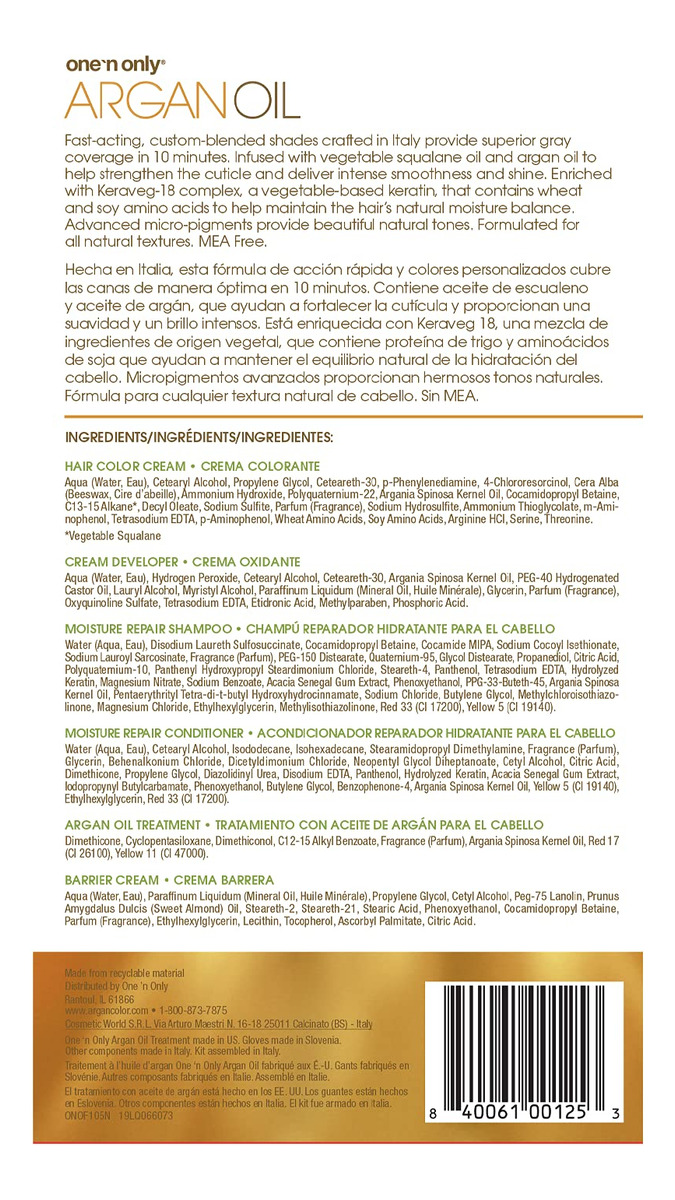 – SUPRIMENTOS INCLUÍDOS: One 'n Only's Argan Oil Fast 10 kits permanentes de coloração de cabelo são embalados como um kit de uso único com todos os suprimentos necessários para aplicar a cor no kit.