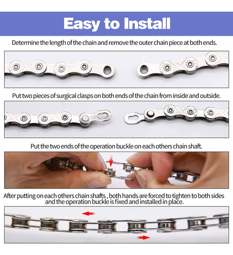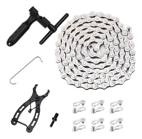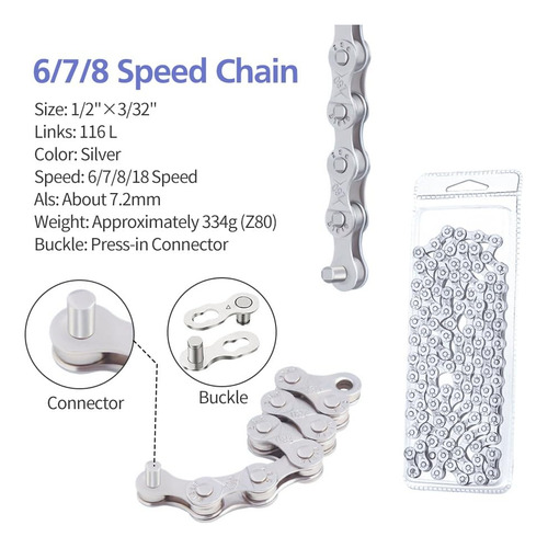 Package List: 1 6/7/8 speed bike chain, 1 Chain breaker, 1 Bike link plier with hook, 6 pair 6/7/8 speed chain buckle. – Package Includes: The kit includes 1 set 6/7/8 speed chain, 1pcs bike link plier with hook, 1pcs chain breaker and 6 pairs of bicycle chain buckle, they are efficient, accurate matching and labor-saving. – High-quality Material: Our bike chains are made of special forging steel which is repeated forged and strict controlled of materials to ensure the strength. The are full plating silver to anti-rust, high cost performance, anti-corrosion, wear-resistant and durable. – Double X Bridge Design: Double X bridge design of the bike chain kit improves the tensile, torsional strength of the chain and have variable speed fluency improvement. – Easy to Install: The bike chain is easy to install, you can determine the length of your chain according to the original chain, cut out the length you want with a chain cutter, and install the chain with a chain hook. – Wide Application: The bike chain kit is suitable for 6-speed, 7-speed, 8-speed road and mountain bikes. It is suitable for shimano and SRAM variable-speed systems.