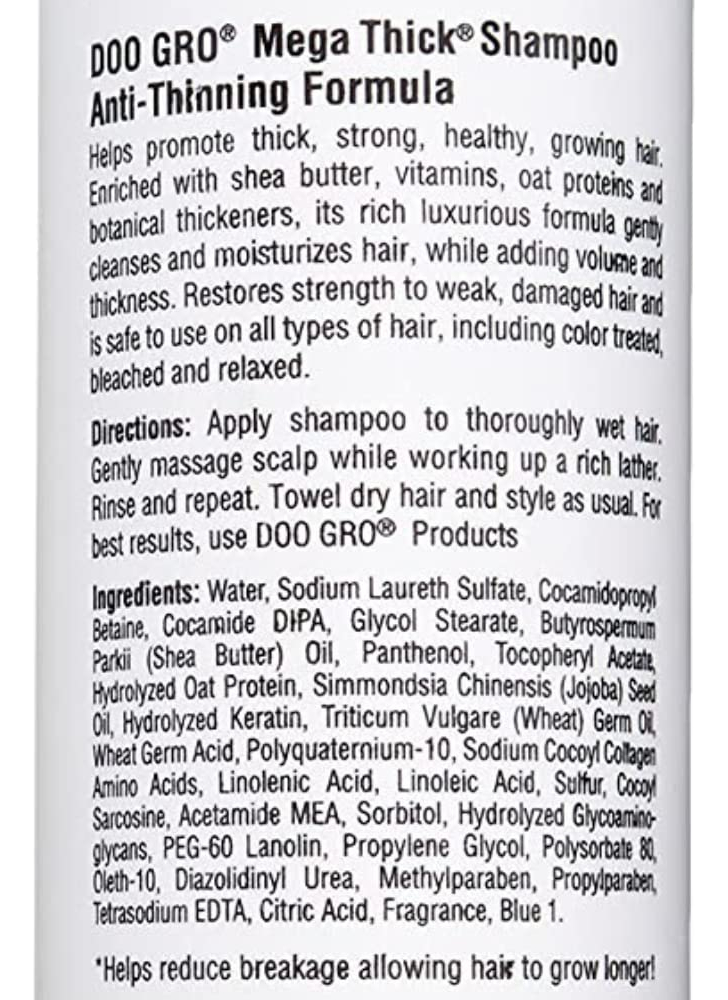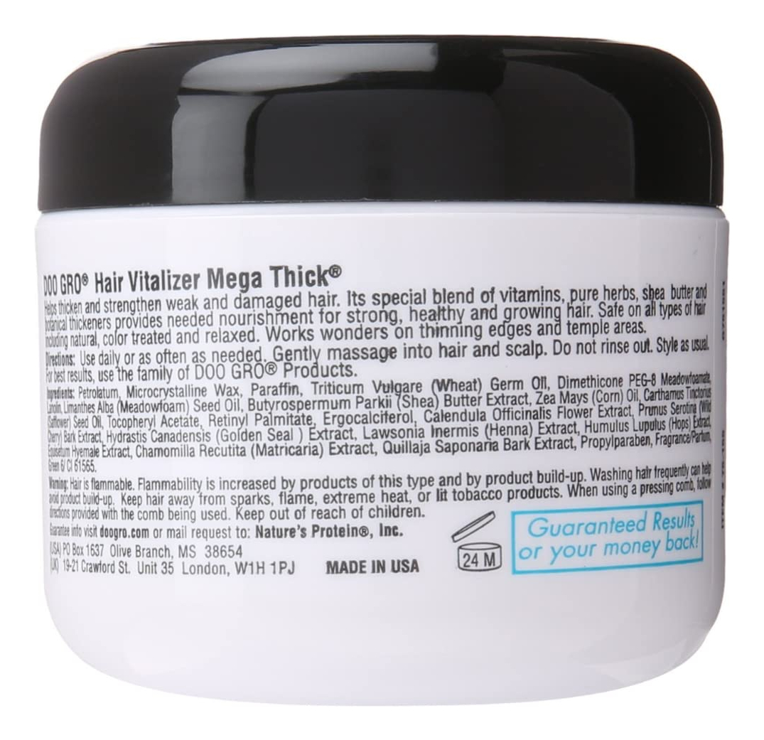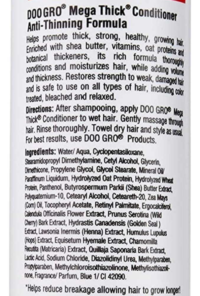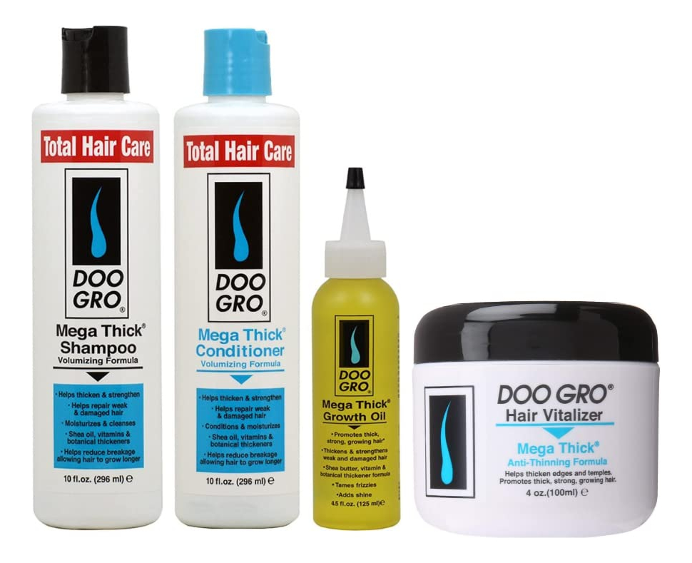 O shampoo Doo Gro Mega Thick hidrata e limpa o cabelo ajudando a reduzir a quebra. Este shampoo mega espesso é enriquecido com manteiga de karité, vitaminas e espessantes botânicos para promover cabelos grossos e fortes. O shampoo Doo Gro Mega Thick é seguro para uso em todos os tipos de cabelo, incluindo cabelos tingidos, descoloridos e relaxados. O condicionador Doo Gro Mega Thick ajuda a promover cabelos espessos, fortes, saudáveis e em crescimento. Enriquecida com manteiga de karité, vitaminas, proteínas de aveia e espessantes botânicos, sua fórmula rica condiciona e hidrata completamente o cabelo, ao mesmo tempo que adiciona volume e espessura. Restaura a força dos cabelos fracos e danificados e é seguro para uso em todos os tipos de cabelo, incluindo cabelos tingidos, descoloridos e relaxados. O óleo de crescimento Doo Gro Mega Thick ajuda a engrossar e fortalecer os cabelos fracos e danificados. Sua mistura especial de proteína de aveia, extrato de aveia, óleo de semente de prado, vitaminas, ervas puras, manteiga de karité e espessantes botânicos fornece a nutrição necessária para cabelos fortes e saudáveis. O óleo de crescimento Doo Gro Mega Thick é seguro para crianças e pode ser usado em todos os tipos de cabelo, incluindo tingidos, relaxados e trançados. Doo Gro Mega Thick Hair Vitalizer ajuda a engrossar e fortalecer os cabelos fracos e danificados. Sua mistura especial de vitaminas, ervas puras, manteiga de karité e espessantes botânicos fornece a nutrição necessária para cabelos fortes e saudáveis. Seguro em todos os tipos de cabelo.