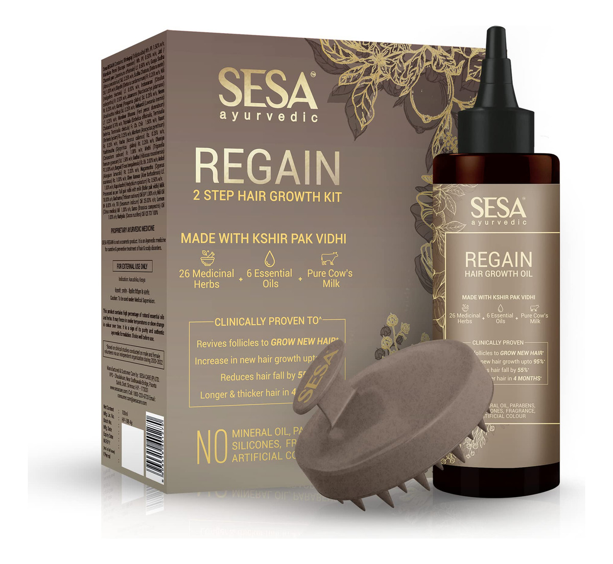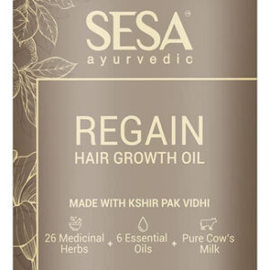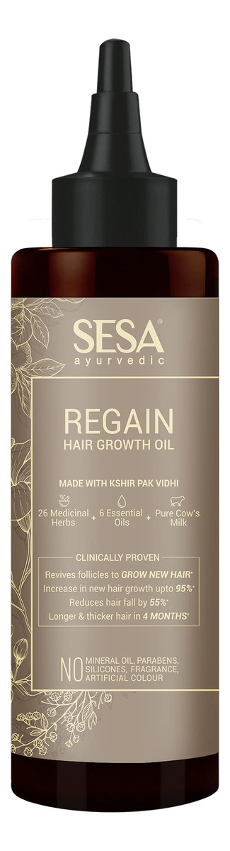 “POR QUE ESCOLHER O SESA Regain 2 step Hair Growth – 100% natural – Certificado como ayurvédico – Sem cor e sem fragrância – Sem ativos sintéticos BENEFÍCIOS DO Kit de crescimento capilar SESA Regain em 2 etapas – Clinicamente comprovado que revive folículos capilares para desenvolver novos cabelos – Aumenta o crescimento do cabelo – Redução da queda de cabelo em 55% – Cabelos mais longos e grossos em 4 meses – Comprovado clinicamente como eficaz contra o eflúvio telógeno em mulheres e alopecia androgenética em homens* *Com base em estudos clínicos realizados em voluntários do sexo masculino e feminino por meio de uma organização independente durante 2020-2022" – Promove o crescimento do cabelo: Sesa O óleo Regain Hair fortalece os folículos pilosos e melhora a saúde do couro cabeludo para promover o crescimento do cabelo. – Reduz a queda de cabelo: nossa fórmula, com 26 ervas e 6 óleos essenciais como óleo de coco e limão, reduz a queda do cabelo, fortalece os folículos e nutre o couro cabeludo para um cabelo mais saudável e cheio. – Fortalece e engrossa o cabelo: o óleo de cabelo Sesa Regain reforça os fios e folículos, aumentando a espessura e a resiliência do cabelo. – Crescimento capilar clinicamente comprovado: comprovado clinicamente que revive os folículos capilares, reduz a queda de cabelo em 55% e aumenta o crescimento de novos cabelos em até 95%, oferecendo resultados visíveis para queda de cabelo. – Ingredientes naturais e seguros: Feito com ingredientes naturais de origem ética, nosso óleo para cabelo é livre de substâncias químicas nocivas, livre de crueldade e enriquecido com óleos essenciais terapêuticos, tornando-o seguro para todos os tipos de cabelo.