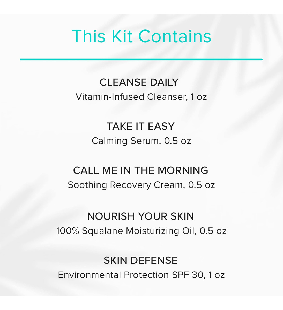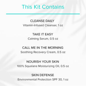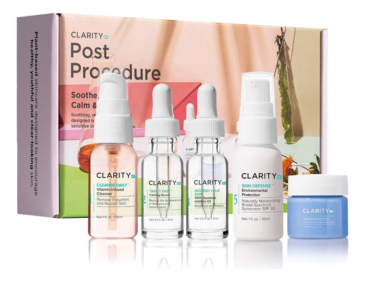 O kit de cuidados com a pele pós-procedimento ClarityRx inclui sabonete facial natural com infusão de vitaminas, sérum facial calmante, hidratante calmante, óleo hidratante e protetor solar SPF 30 – Projetado para otimizar e complementar os resultados finais de tratamentos progressivos, como peelings ou microdermoabrasão – Este regime simples ajuda no processo de reparação, pois acalma e nutre a pele – Recomendado Para: Todos os tipos de pele. Excelente para pele após o procedimento.