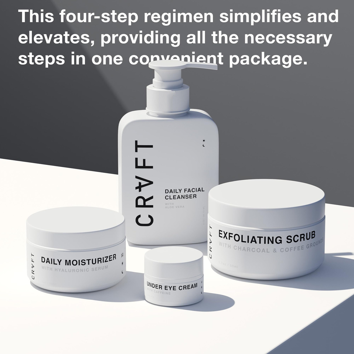 CRVFT – UM SISTEMA COMPLETO DE CUIDADOS COM A PELE – Nosso kit de cuidados com a pele Essentials em 4 etapas foi projetado para homens e fabricado nos EUA usando apenas os melhores ingredientes. Este kit cobre todas as suas bases com um limpador diário com infusão de aloe, esfoliante à base de carvão, hidratante profundo alimentado por ácido hialurônico e creme revigorante para os olhos. – Projetado para homens – Nossos produtos são desenvolvidos para o homem moderno e testados em relação aos fatores ambientais que enfrentamos diariamente. Melhore sua rotina diária e cuide do seu maior patrimônio, seu rosto. Se você deseja se livrar das células mortas da pele, combater rugas e linhas finas ou apenas manter a pele hidratada, este kit tem de tudo. – SEM PARABENOS E SULFATO – Você pode ficar tranquilo sabendo que nenhum de nossos produtos é feito com produtos químicos agressivos. Os produtos CRVFT não contêm parabenos ou sulfatos, o que significa que são mais seguros para a pele e não causam irritação ou ressecamento. Feito pensando na sua segurança, sem sacrificar o desempenho. – FEITO NOS EUA – Todos os nossos produtos para a pele de alta qualidade são feitos nos EUA usando apenas os melhores ingredientes. Projetado na Califórnia e fabricado na Flórida, seu novo produto favorito para a pele já está mais perto do que você pensa. – SEUS NOVOS PRODUTOS FAVORITOS PARA A PELE. GARANTIDO — Como uma pequena empresa local, somos tão fortes quanto a comunidade que nos apoia. Se você é um cliente de longa data ou alguém que está começando a arrumar o cabelo, avise-nos se seu produto não corresponder às expectativas e nós o faremos da maneira certa.