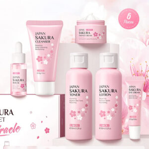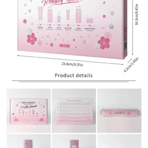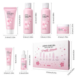 1 pacote de conjunto de cuidados com a pele Sakura, contendo limpador facial de limpeza profunda+creme facial hidratante + soro facial que refina a pele+creme firmador para os olhos+tônico facial+emulsão facial – O pacote de produtos pode ser atualizado frequentemente de lote para lote. – O pacote contém limpador facial 50g+creme facial 25g+creme facial 15g+soro facial 17ml+toner facial 100ml+emulsão facial 100ml. – Infundido com extrato vegetal, vitamina C, que ajuda a hidratar a pele. – O limpador facial limpa profundamente a pele. O sérum facial ajuda a refinar a pele, o creme para os olhos ajuda a remover olheiras e linhas finas ao redor dos olhos. O creme facial, o tônico e a emulsão hidratam a pele e tornam a pele clara. – Fabricado na China. Vem com uma linda caixa de presente, a embalagem é fácil de transportar.
