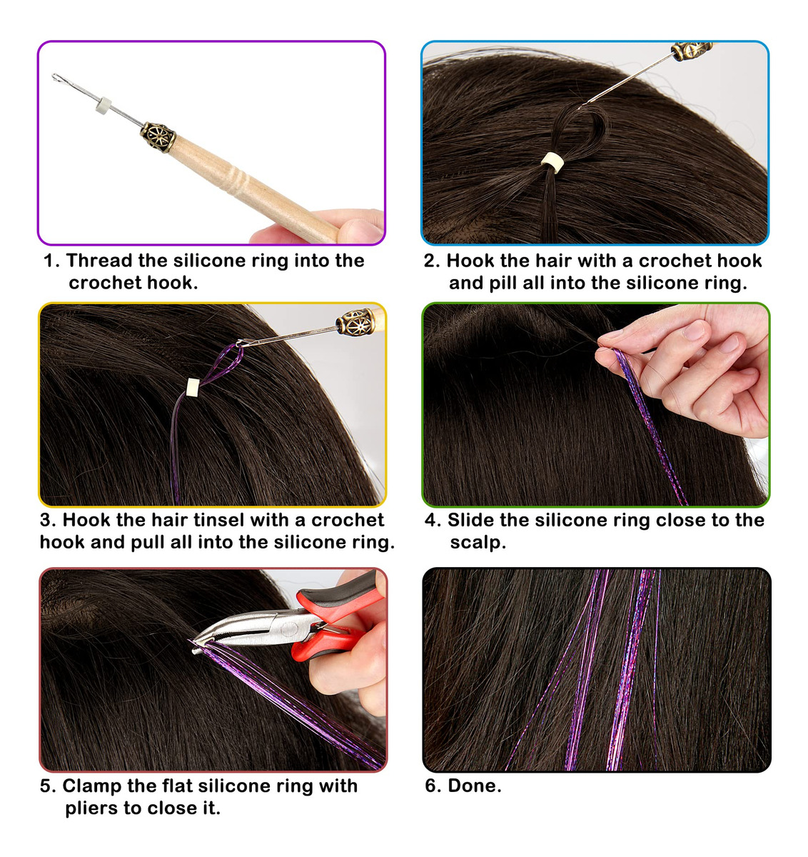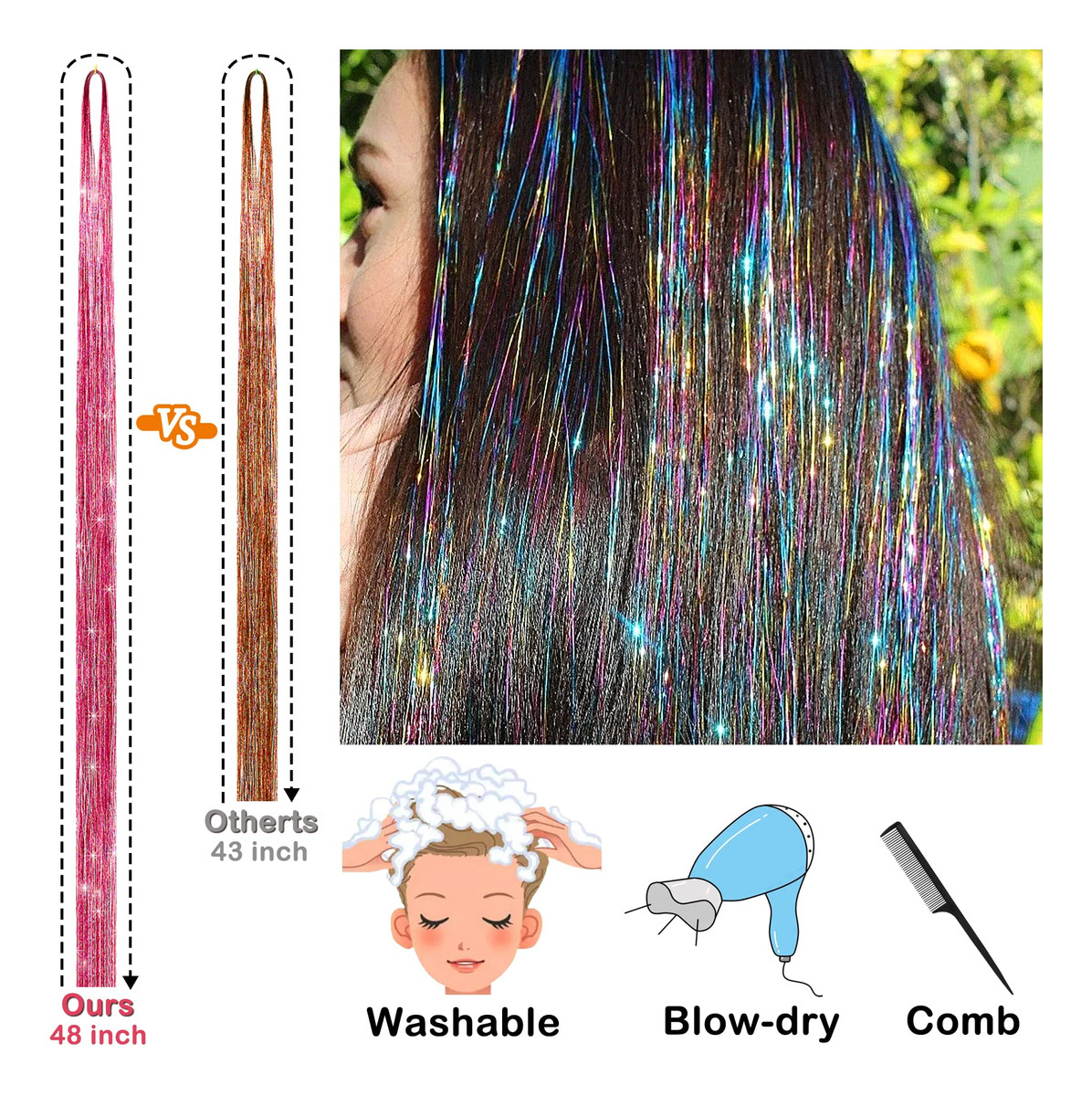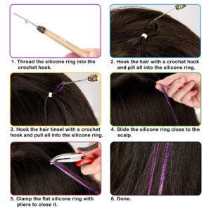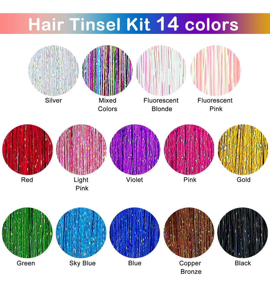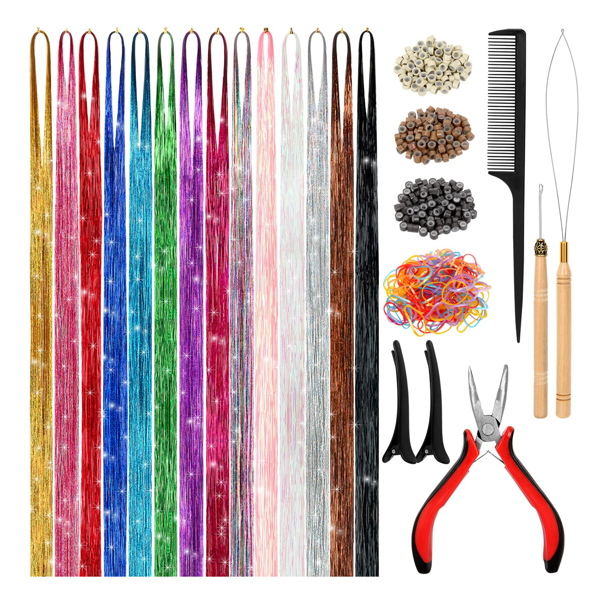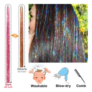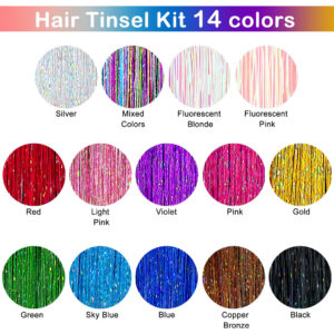 ESPECIFICAÇÕES Nome do produto: enfeite de cabelo Material: enfeite de extensão de cabelo de fibra de poliéster Tamanho: aproximadamente 48 polegadas Cores: azul celeste, vermelho, dourado, azul, preto, cores misturadas, violeta, rosa, verde, prata, loiro fluorescente, rosa fluorescente, rosa claro e bronze cobre O que está incluído 3500 fios de enfeite de cabelo 1 x agulha de crochê 1 x alicate 1 x pente de rabo de rato 2 x grampos de cabelo 1 x Threader Pacote de elásticos coloridos, 3 pacotes de miçangas de microsilicone Link Rings (pretas, loiras e marrons). O WARM TIP contém itens pequenos, mantenha-os longe do alcance de crianças. — Kit de enfeites de cabelo com Ferramentas: Você receberá 3500 fios de extensões de enfeites de cabelo em 14 cores diferentes e uma gama completa de acessórios de cabelo, incluindo 1 agulha de crochê, 1 alicate, 1 pente para rabo de rato, 2 grampos de cabelo, 1 rosqueador, 1 pacote de elásticos coloridos e 3 pacotes de miçangas de microsilicone (preto, loiro e marrom). – Fairy Hair Tinsel Colors: nossas extensões de cabelo de ouropel vêm em 14 cores diferentes para escolher, incluindo azul celeste, vermelho, dourado, azul, preto, cores mistas, violeta, rosa, verde, prata, loiro fluorescente, rosa fluorescente, rosa claro e bronze cobreado. – Calor Extensões de enfeites de cabelo resistentes: Feita com fios de cabelo 100% poliéster de alta qualidade, nossa extensão de enfeites de cabelo é segura, resistente ao calor, inodora e não desbota. Eles podem ser lavados, secados, alisados, passados a ferro ou penteados com confiança. Dicas: Ao usar talas, modeladores e outras ferramentas para modelar, controle a temperatura em 200 graus. – Fios de cabelo ajustáveis: esses fios de enfeites de cabelo de 48" são longos o suficiente para serem cortados em comprimentos diferentes, dependendo dos requisitos de extensão de cabelo, e vêm com todas as ferramentas necessárias para aplicá-los, o que é muito fácil de usar e dura um pouco. – Amplas aplicações: nosso kit de enfeites de cabelo vem em um conjunto completo para facilitar o uso, perfeito para penteados do dia a dia, Natal, Ano Novo, Halloween, cosplay, festas de aniversário, etc., proporcionando uma cor e brilho incríveis aos cabelos e fazendo você se destacar da multidão.