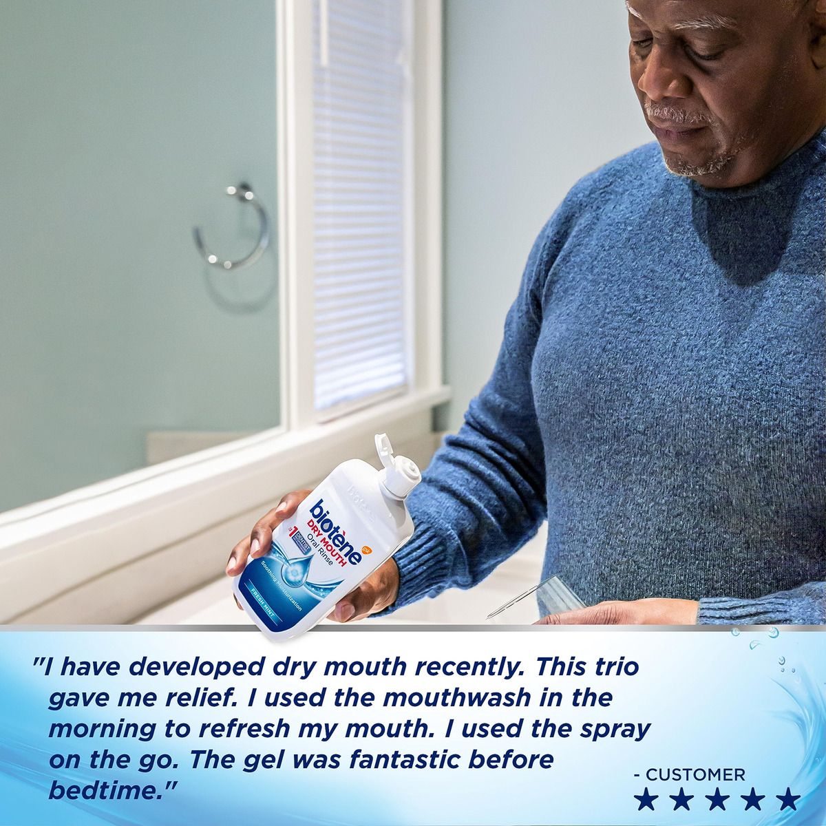 Enxágue oral biotne Dry Mouth Management, spray para boca seca e gel hidratante – 1 kit – Um enxaguante bucal com bioteno, spray para boca seca e gel hidratante – O enxágue oral e o spray oral com bioteno fornecem até quatro horas de alívio dos sintomas da boca seca – Produtos para boca seca que apresentam um sistema hidratante bucal que ajuda a acalmar e proteger os tecidos orais – Produtos hidratantes bucais que atuam como purificadores de hálito e ajudam mantenha um ambiente bucal saudável – Inclui enxaguante bucal sem açúcar, sem sabor e sem álcool – Gel de boca seca com bioteno e ambos os sprays para respiração vêm em embalagens portáteis e discretas – Use conforme necessário ou com outros produtos para boca seca como parte de uma rotina regular de higiene bucal