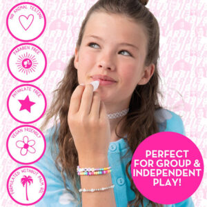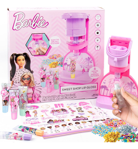 Kit de fabricação de gloss Barbie Sweet Shop, faz 12 acessórios, gloss labial e chaveiros, kit de arte e artesanato para crianças a partir de 6 anos, presentes para meninas de 6 anos — CRIE 12 CHAVEIROS BARBIE LIP GLOSS: preencha tubos coloridos com a base transparente de brilho labial de morango mais doce e 6 misturas divertidas e decore com adesivos e chaveiros para transformá-los em glosses oficiais da Barbie que você pode levar para qualquer lugar! – ESTAÇÃO DE PREENCHIMENTO FÁCIL DE USAR: O criador de brilho labial exclusivo torna a mistura exigente e a medição complicada uma coisa do passado. Conecte o tubo vazio à base, coloque os enfeites e encha com diversão! – REUTILIZÁVEL: A estação de brilho labial tudo-em-um pode ser usada repetidamente! Enxágue a máquina e feche novamente as bolsas brilhantes para guardar a diversão para outro dia! – NOSSA PROMESSA DE BELEZA LIMPA: tudo incluído neste conjunto de brilho labial foi desenvolvido com fórmulas veganas e ingredientes de beleza limpos, livres de parabenos, ftalatos e produtos químicos agressivos. – O conjunto inclui: 1 estação de preenchimento de brilho labial (5 polegadas x 2,8 polegadas x 8,25 polegadas), 3 palitos de madeira, base de brilho labial transparente, base de brilho labial de morango, 12 tubos de brilho labial Gold Heart Confete (1 g), 1 pacote de confete redondo rosa (1 g), 1 pacote de confete holográfico Star (1 g), 1 pacote de fatias de rosto sorridente de polímero (2 g), 1 pacote de fatias de flores de polímero (2 g), 1 pacote de polímero Rainbow Slices (2 g), 1 pacote de fatias de coração de polímero (2 g), 1 folha de adesivos, 3 chaveiros, 3 pingentes de borracha, instruções fáceis de seguir