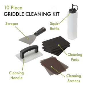 Cuisinart CCK-358 Griddle Cleaning Kit, 10-Piece – TEN ESSENTIAL TOOLS FOR GRIDDLE CLEANING: Sturdy Scraper, cleaning handle, four cleaning pads, three cleaning screens, and squirt bottle provides everything needed for a deep clean. – STURDY SCRAPER: The stainless-steel blade removes burnt, caked-on foods and grease with ease, removing even the toughest stuck on food or grime. – CLEANING HANDLE AND FOUR PADS: The cleaning handle provides an easy grip and the leverage needed to remove burnt-on food and grease when using the cleaning pads. – THREE CLEANING SCREENS: The cleaning screens provide easy removal of baked on residue and grime. – SQUIRT BOTTLE: Use the squirt bottle to apply water or vegetable oil to cleaning pad or over the griddle top to get a deep clean. When it is thoroughly cleaned, add a little vegetable oil to the top to season.