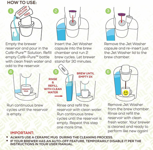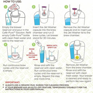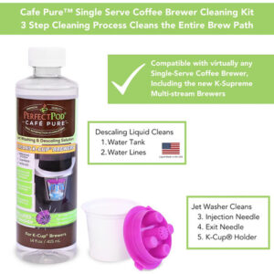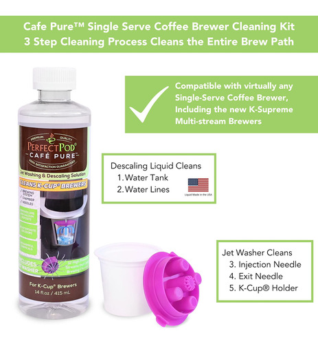 O kit de limpeza 2 em 1 para máquina de lavar a jato Cafe Pure Discaling Solution Rinser da Perfect Pod limpa todo o caminho de preparação de sua cafeteira de dose única. Do reservatório de água até a agulha de saída, todas as peças são limpas. Cada garrafa do kit de limpeza de agulhas Cafe Pure Descaling Solution Rinser Jet Washer da Perfect Pod é fornecida com a máquina de lavar a jato exclusiva da Perfect Pods, que limpa as partes mais esquecidas de sua cervejaria. Os 12 fluxos de alta pressão lavam a câmara de infusão para remover resíduos que se acumulam naturalmente com o tempo. E a cápsula em formato de cápsula de café força a solução de limpeza através da agulha de saída para garantir que todos os depósitos sejam removidos. Especialmente formulado para atacar até mesmo os depósitos mais difíceis de calcário e cálcio, o kit de limpeza para máquina de lavar a jato Cafe Pure Descaling Solution Rinser da Perfect Pod não é tóxico, é biodegradável e não deixa sabores ou odores. Inclui 1 frasco de solução de limpeza e 1 lavadora a jato para uma limpeza mais limpa! – Poderoso sistema de limpeza de cafeteira natural 2 em 1 – 1. Solução de limpeza e descalcificação (FABRICADA nos EUA) 2. Lavadora a jato com fluxos de alta pressão para limpar lugares que outros sistemas não conseguem alcançar! – Remove os depósitos mais difíceis de cal e cálcio que podem deixar sabores desagradáveis em seu café – Somente o sistema de limpeza 2 em 1 disponível, limpa todo o caminho da fermentação, melhora a vida útil da máquina – Não deixa sabor residual ou odores – A lavadora a jato Cafe Pure agora é compatível com os novos modelos Keurig Supreme de 5 fluxos e praticamente todas as outras cervejarias em formato K-cup de dose única.
