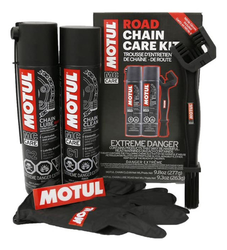 Kit de lubrificação MOTUL 109767 Motorcycle Chain Clean C1 C2 Complete MC Care System Road Street – Pacote completo para limpar e manter sua corrente – Inclui corrente limpa, lubrificação de corrente, escova de corrente, luvas e decalque Motul – C1 Chain Clean é perfeito para remover resíduos, areia, sujeira e óleo. – C2 Chain Lube Road é um produto da história de corridas da MOTUL, protegendo sua corrente e reduzindo arrasto. – As luvas e a escova de corrente MOTUL ajudam a remover depósitos sem criar bagunça. – Adequadas para uso em todos os tipos de correntes: O-Ring, X-Ring, Z-Ring e muito mais.