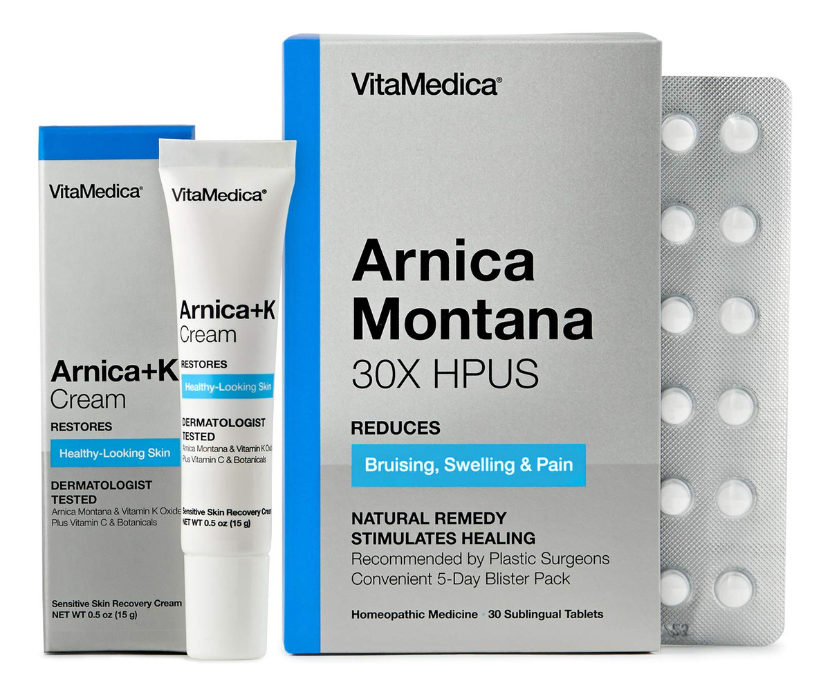 Doctors top choice arnica pills. Plastic surgeons love our arnica tablets for bruising & swelling after surgery especially because we offer arnica and bromelain as well. See for yourself why our Arnica Montana 30X formulas are the best arnica tablets for bruising, pain, inflammation, and stiff, sore muscles. Arnica 30X potency HPUS homeopathic arnica tablets are formulated by a physician and manufactured in GMP-certified facilities located in the USA. With strict quality standards, our arnica tablets are the best bruise pills on the market. Hate unsightly bruising and greasy trauma oils? Our silky, elegant bruise cream delivers the benefits of arnica cream, vitamin K cream, horse chestnut cream, comfrey cream, and collagen cream, all in one. Why settle with just an arnica Montana cream? VitaMedicas unique blend of arnica, vitamin K, vitamin C, and botanicals clears up skin discoloration and redness faster than typical arnica bruise creams or greasy arnica ointments. Apply a pea-sized amount to the skin 2-5 times daily. The nanotechnology delivery system ensures penetration into the skin. Softens the look of bruising and dark spots. Doubles as an eye cream for dark circles and puffiness. Arnica+K Cream by VitaMedica is perfect for everyday bumps and bruises, after injectables and fillers, and facial or dental procedures. A perfect add-on to VitaMedicas Arnica Montana 30X tablets or Bromelain for bruising and swelling. – Simplify Your Healing: Travel friendly 5 day arnica blister pack fits easily in your purse or overnight bag. Two tiny arnica tablets under the tongue three times a day is all you need. Our arnica tablets for bruising can help speed your healing. – Arnica for Bruising & Swelling: Take Arnica Montana 30X immediately after surgery, fillers, dental work, or soft tissue injury. Use it to also treat bruising, pain, inflammation, and stiff, sore muscles. – Restore Healthy Looking Skin: Our silky, elegant cream moisturizes, softens, calms, and restores bruised skin with the help of key ingredients like Arnica, vitamin K cream, horse chestnut, comfrey, & collagen cream. – Ideal for Bruising & Cosmetic Procedures: Our non greasy cream is perfect for everyday bumps and bruises. An ideal solution after cosmetic procedures such as fillers, injectables, and facial or dental procedures. Best suited for smaller areas including the face, neck and back of the hands. – Plastic Surgeons Best Kept Secret: Top doctors nationwide love VitaMedicas Arnica with Vitamin K cream and Arnica 30X tablets for bruises. Our clinically proven products have been recommended by professionals for over 25 years.
