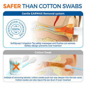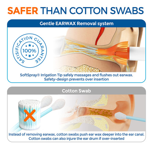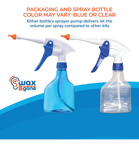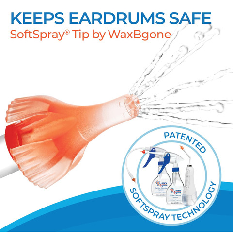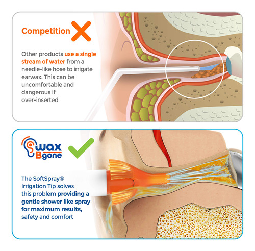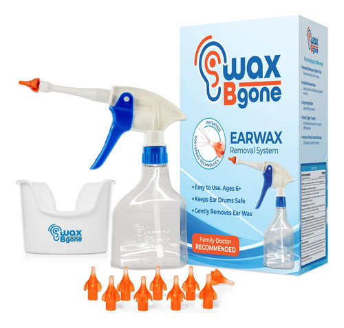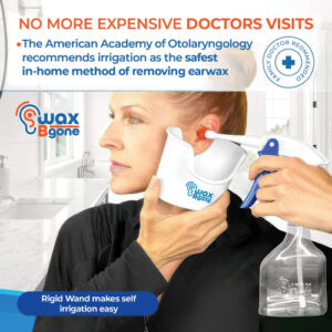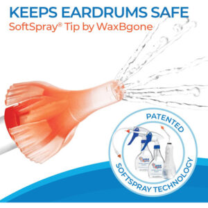 SAFE AND EFFECTIVE EAR WAX REMOVAL The key to safely and efficiently removing impacted ear wax is carefully controlled high water pressure. The WaxBgone ear flushing kit features a seven-stream SoftSpray Irrigation Tip that directs water pressure toward the outer walls of the ear canal rather than directly at the eardrum. This exclusive design safely delivers 4 times the water volume per spray over other brands for more effective ear wax removal. In addition, the custom flared tip-end prevents over-insertion. THE WAXBGONE DIFFERENCE The WaxBgone system is designed by a Board Certified ENT Physician for ear cleaning without risk of damaging the sensitive eardrum. Many ear flushing kits on the market use a needle-like hose that shoots a single high pressure stream of water into the ear canal. This can be uncomfortable and dangerous. These systems also lack a safety device to prevent over-insertion into the ear canal. WaxBgone ear cleaner system was designed to eliminate these dangers. – MORE EFFICIENT AND EFFECTIVE – This ear wax remover has 4X the water volume and pressure per spray. The performance output trigger allows for superior wax removal flushing action compared to other ear irrigation kits. – UNIQUE SOFTSPRAY IRRIGATION TIP sprays 7 shower-like streams of water into the ear canal to keep eardrums safe. The resulting vortex effect loosens and dislodges stubborn earwax. Flared design prevents over-insertion. – THE SAFE ALTERNATIVE – Other earwax removal tools shoot a single jet stream into the ear canal without any safety feature to protect sensitive eardrums. The Exclusive SoftSpray Irrigation Tip eliminates this danger. – AVOID EXPENSIVE DOCTORS VISITS with this home ear flush kit. Designed by a Board Certified ENT Physician and produced by a family-owned American company, WaxBgone brings you a professional ear wax removal system. – EAR CLEANING ESSENTIALS – Includes an 11oz Spray Bottle with high output trigger pump, ear basin, 10 resuable SoftSpray Irrigation Tips, and easy to follow instructions.