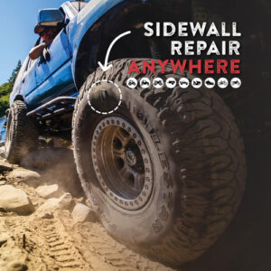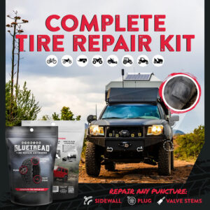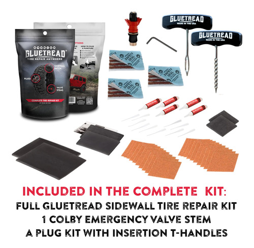 O kit inclui um kit completo de reparo de pneus de parede lateral GluetRead, 1 haste de válvula de emergência Colby (fabricada nos EUA com componentes de latão Quality 360, sem necessidade de ferramentas, é instalada pela parte externa da roda em menos de 5 minutos), um kit de plugues com alças em T de inserção (fabricado em Montana a partir de alumínio usinado) e instruções detalhadas.