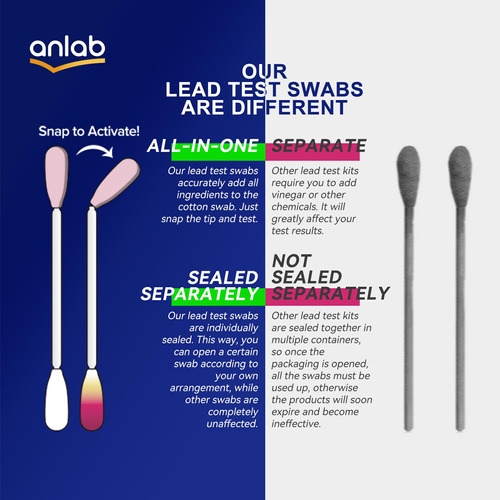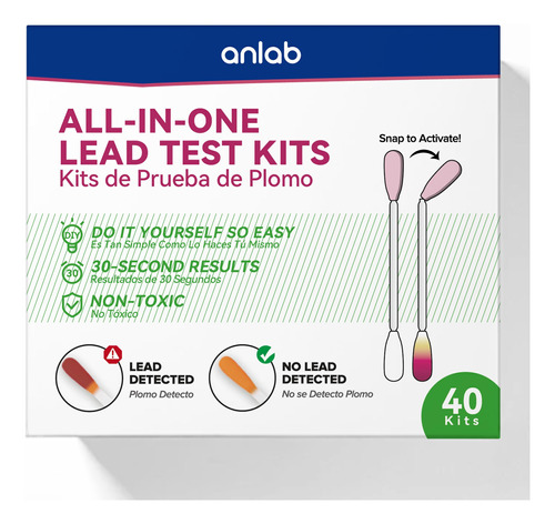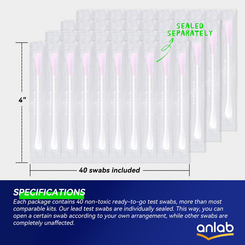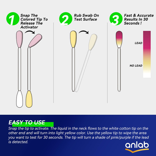 SOLUÇÃO TUDO-EM-UM: Outros kits de teste de chumbo exigem que você adicione vinagre ou outros produtos químicos. Isso afetará muito os resultados do teste. Não é um laboratório. Nossos cotonetes de teste de chumbo adicionam com precisão todos os ingredientes ao cotonete. Basta apertar a ponta e testar. – SOLUÇÃO TUDO-EM-UM: Outros kits de teste de chumbo exigem que você adicione vinagre ou outros produtos químicos. Isso afetará muito os resultados do teste. Não é um laboratório. Nossos cotonetes de teste de chumbo adicionam com precisão todos os ingredientes ao cotonete. Basta encaixar a ponta e testar. – FÁCIL DE USAR: Encaixe a ponta para ativar. O líquido no pescoço flui para a ponta de algodão branco na outra extremidade e se transformará em amarelo claro. Use a ponta amarela para limpar a área que você deseja testar por 30 segundos. A ponta ficará com um tom de rosa/roxo se o chumbo for detectado. – RESULTADOS DE 30 SEGUNDOS: Evite a exposição ao chumbo! Os cotonetes de teste de chumbo da anlab fornecem resultados precisos em até 30 segundos. – 40 cotonetes INCLUÍDOS: Cada pacote contém 40 cotonetes de teste não tóxicos prontos para uso, mais do que a maioria dos kits comparáveis. Dica: Um leve cheiro de vinagre após ativar o cotonete é um fenômeno normal. – VÁRIAS APLICAÇÕES: O kit de teste de chumbo anlab é mais frequentemente usado para testar o chumbo em superfícies pintadas. Mas, com exceção da cerâmica, ele também pode ser usado em outras superfícies, incluindo antiguidades, brinquedos, marcenaria, joias, esmaltes de banheira e encanamentos.