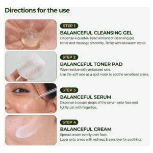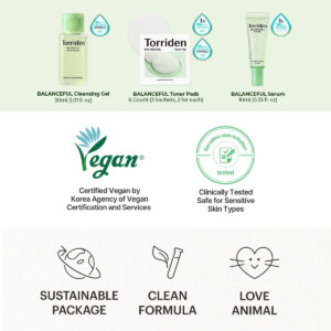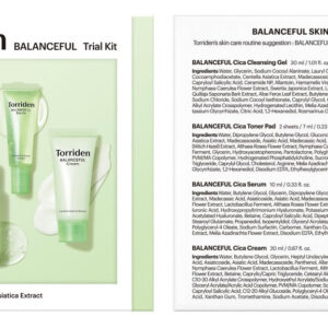 Kit de teste Torriden BANALCEFUL (sérum balanceful 10 ml+creme balanceful 20 ml + gel de limpeza balanceful 30 ml + bolsa de toner balanceful 2P*3ea)/Objetivo: limpador facial e hidratantes – Uma rotina experimental de cuidados com a pele para viagens com 4 produtos BALANCEFUL diferentes – 3 sachês de gel de limpeza (lavagem facial LHA), 3 sachês de toner Ads (2 folhas para cada sachê), sérum facial (0,34 fl oz) e hidratante facial (0,68 fl. Oz.) – [Balanceful Cleansing Gel] é um limpador facial diário calmante misturado com extrato de Centella Asiatica (Gotu Kola) e LHA (Lipohidroxiácido) para acalmar, esfoliar e remover sujeira e impurezas. – [Balanceful Toner Pad] é uma almofada esfoliante suave embebida com essência de Cica. Não só a essência, mas também a almofada é vegana para a sustentabilidade. Acalma, hidrata e prepara a pele com eficácia. – [Balanceful Serum] é um sérum de tratamento balanceador sobrecarregado com Centella Asiatica Concentrate, proporcionando hidratação instantânea, calmante e equilíbrio. – [Balanceful Cream] é um hidratante diário que completa sua rotina de cuidados com a pele adicionando hidratação extra com pantenol e ácido hialurônico