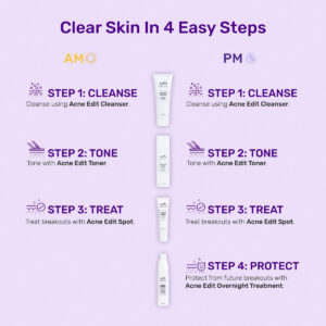 Mudar sua pele nunca foi tão fácil! Basta criar a rotina certa com nosso sistema simples de edição de acne. Os ingredientes começam a combater a acne imediatamente e, em seguida, ajudam a prevenir futuras erupções cutâneas. Confie no sistema, interrompa seu ciclo. Basta repetir a rotina diária simples e eliminar sua acne! Excluir. Repita. O segredo da edição da acne? Trate a acne e proteja-se de futuras erupções ao mesmo tempo usando os extratos mais poderosos da natureza combinados com os favoritos confiáveis dos dermatologistas. Nosso exclusivo complexo de bactérias inteligentes alimentado por probióticos? reequilibra a pele e defende contra as bactérias da acne. Os ácidos multifrutíferos esfoliam suavemente, enquanto os retinóis naturais das algas verde-azuis ajudam a desobstruir os poros para uma absorção ideal dos ingredientes. O chá verde orgânico ajuda a reduzir a aparência de vermelhidão e a rosa silvestre matifica a pele. SISTEMA DE EDIÇÃO DE ACNE. SIMPLES. RÁPIDO. EFICAZ. – 4 ETAPAS PARA LIMPAR A PELE: O kit de 4 etapas foi formulado especificamente para limpar naturalmente a pele propensa a acne e evitar futuras erupções cutâneas. Limpe, tonifique, trate e proteja. Este conjunto é eficaz para homens, mulheres e adolescentes. – LIMPADOR: Um sabonete facial rico com ácido salicílico para limpar a pele e probióticos para repor bactérias boas. O chá verde acalma a pele para reduzir a vermelhidão. – Tônico: tônico suave e eficaz com casca de salgueiro e hamamélis que esclarece e prepara o rosto para um tratamento específico. Ácidos multifrutas ajudam a purificar e iluminar a aparência da pele. – TRATAMENTO LOCAL: Tratamento de enxofre para acne com máxima intensidade para controle de espinhas no local. O enxofre reduz o tamanho das manchas e ajuda efetivamente a eliminar a acne. O alcaçuz ajuda a acalmar a pele sensível e ajuda a diminuir a aparência de descoloração. – TRATAMENTO NOTURNO: O tratamento leve e invisível funciona a noite toda para combater erupções cutâneas e limpar a pele congestionada. Nosso exclusivo complexo de bactérias inteligentes alimentado por probióticos reequilibra a pele e os braços contra bactérias nocivas. Um arsenal de ácidos naturais, incluindo laranja, limão e maçã, se combina com ácido lático e ácido salicílico para esfoliar e ajudar a aumentar a renovação celular. Os retinóis naturais ajudam a reduzir a aparência de cicatrizes de acne e deixam a pele macia, clara e saudável.