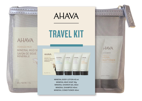 Kit de viagem AHAVA Inclui loção corporal mineral do Mar Morto 1,3 fl.oz, gel de banho mineral 1,3 fl.oz, condicionador mineral 1,3 fl.oz, xampu mineral 1,3 fl.oz e sabonete mineral de lama 1 onça.