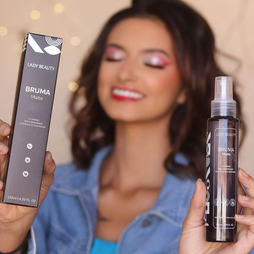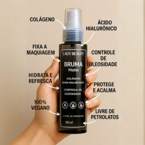 Bruma Fixadora Matte Lady Beauty: spray de 130 ml, com ácido hialurônico e colágeno, acabamento matte duradouro.