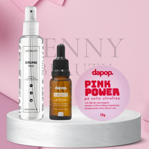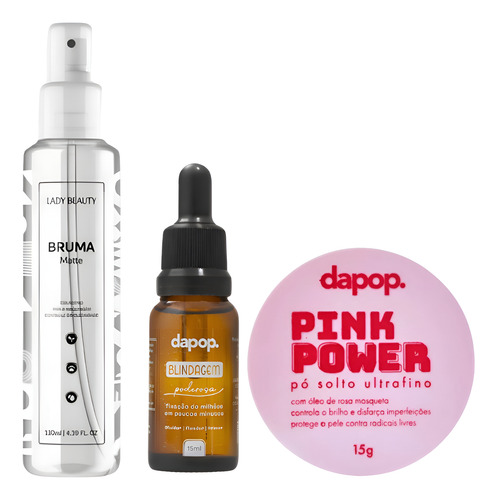 Kit Blindagem Poderosa 3em1 15ml Dapop + Pó Solto Rosa Mosqueta Pink Power 15g Dapop + Bruma Fixadora Matte 130ml Lady Beauty