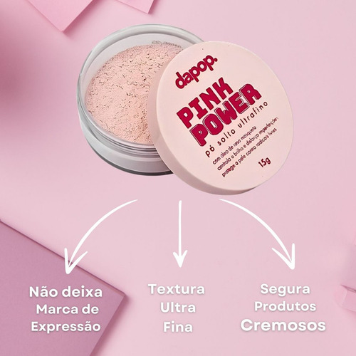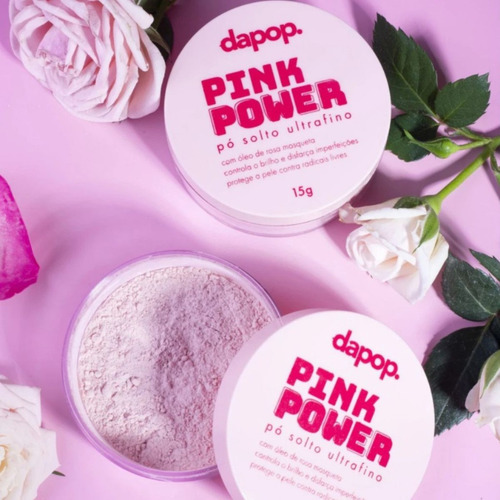 O Pó Solto Ultrafino Pink Power Dapop, enriquecido com óleo de rosa mosqueta, controla o brilho, disfarça imperfeições e protege contra radicais livres, deixando um toque suave e aveludado.