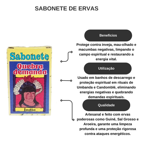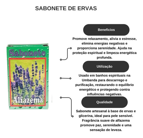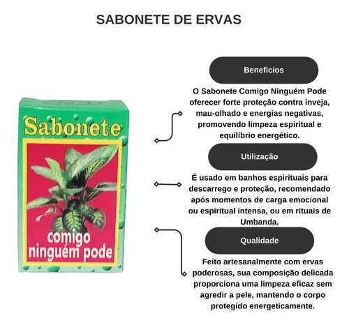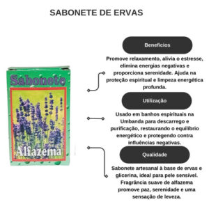 O Kit de Sabonetes Quebra Demanda, Comigo Ninguém Pode e Alfazema é uma combinação poderosa projetada para fornecer proteção, limpeza e purificação espiritual. Cada sabonete é formulado com ervas que atuam em sinergia, ajudando a descarregar energias negativas e quebra-quebras masculinas e invejas. O sabonete “Comigo Ninguém Pode” é especialmente eficaz para proteger contra influências externas, enquanto o “Quebra Demanda” é ideal para remover obstáculos e energias densas. Já o sabonete de Alfazema não só purifica, mas também energias reativas positivas, trazendo um aroma calmante que ajuda a restaurar a paz interior.
