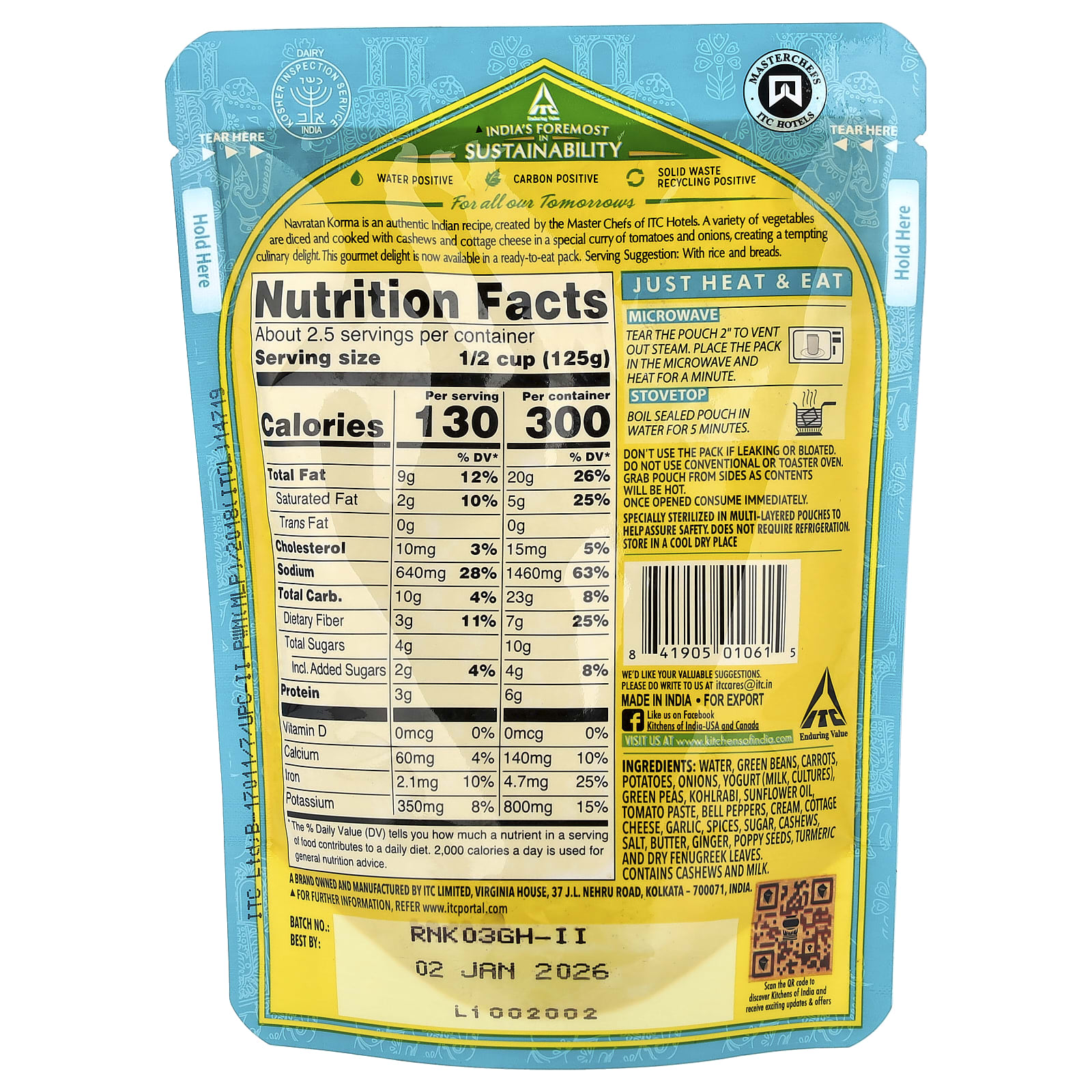 Navratan Korma é uma receita indiana autêntica, criada pelos Master Chefs dos ITC Creams. Uma variedade de vegetais é cortada em cubos e cozida com castanha de caju e queijo fresco em um caril especial de tomates e cebolas, criando uma delícia culinária tentadora. Esta delícia gourmet agora está disponível em uma embalagem pronta para comer.