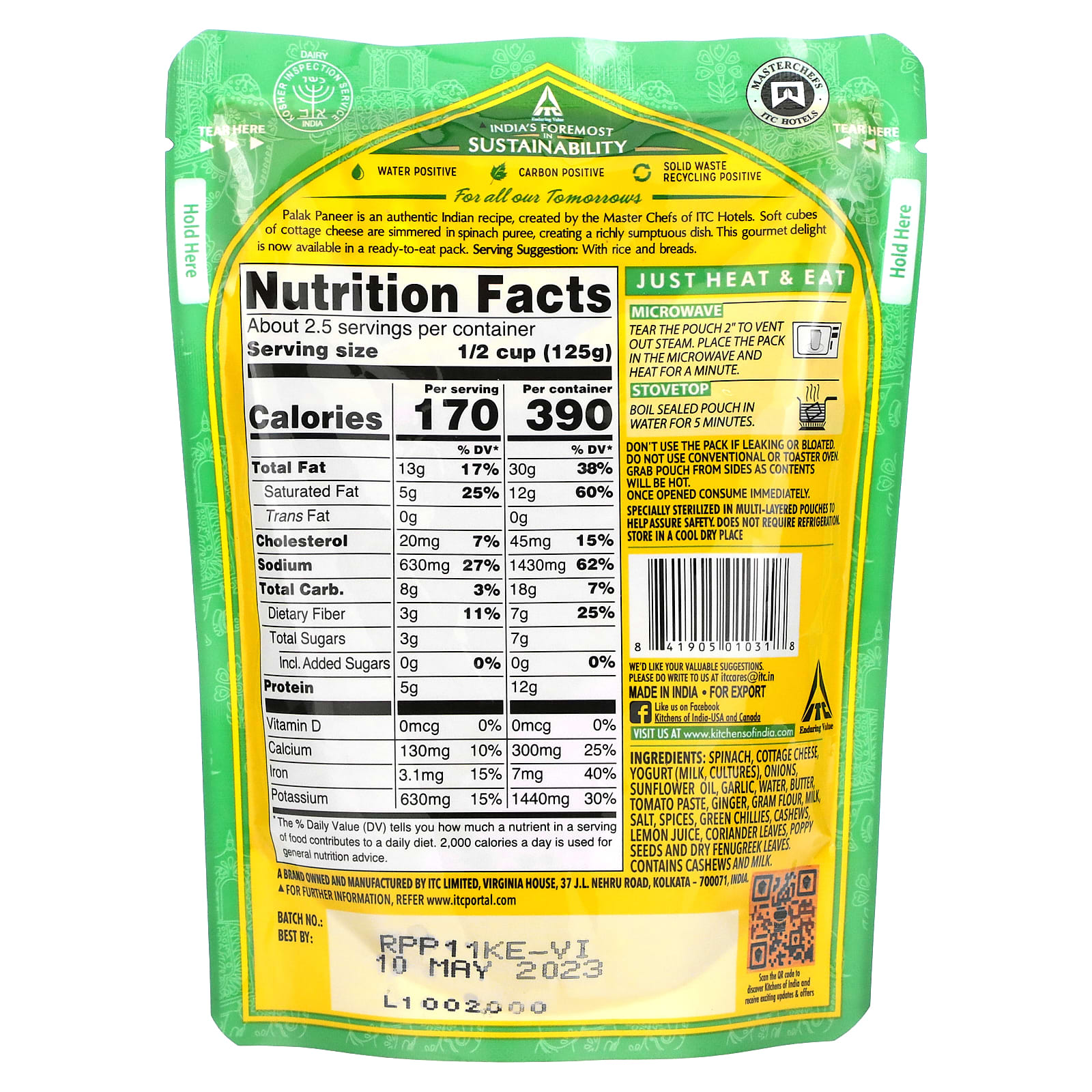 Palak Paneer é uma receita indiana autêntica, criada pelos Master Chefs do ITC Hotels. Cubos macios de queijo cottage são cozidos em um purê de espinafre fresco, criando um prato ricamente sumtuoso. Esta delícia gourmet agora é disponível em uma embalagem pronta para comer.