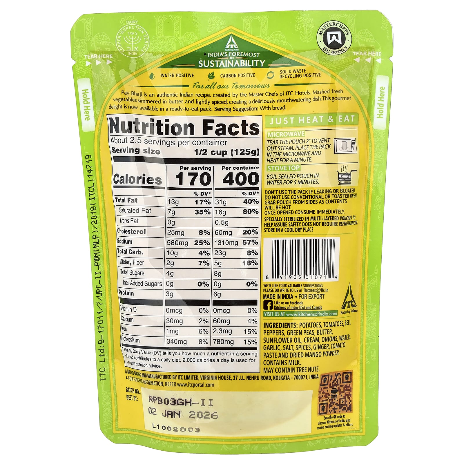 Pav Bhaji é uma receita indiana autêntica, criada pelos Master Chefs dos ITC Creams. Vegetais frescos triturados, cozidos em fogo baixo em manteiga e levemente picantes, criando um prato deliciosamente de dar água na boca. Esta delícia gourmet agora está disponível em uma embalagem pronta para comer.