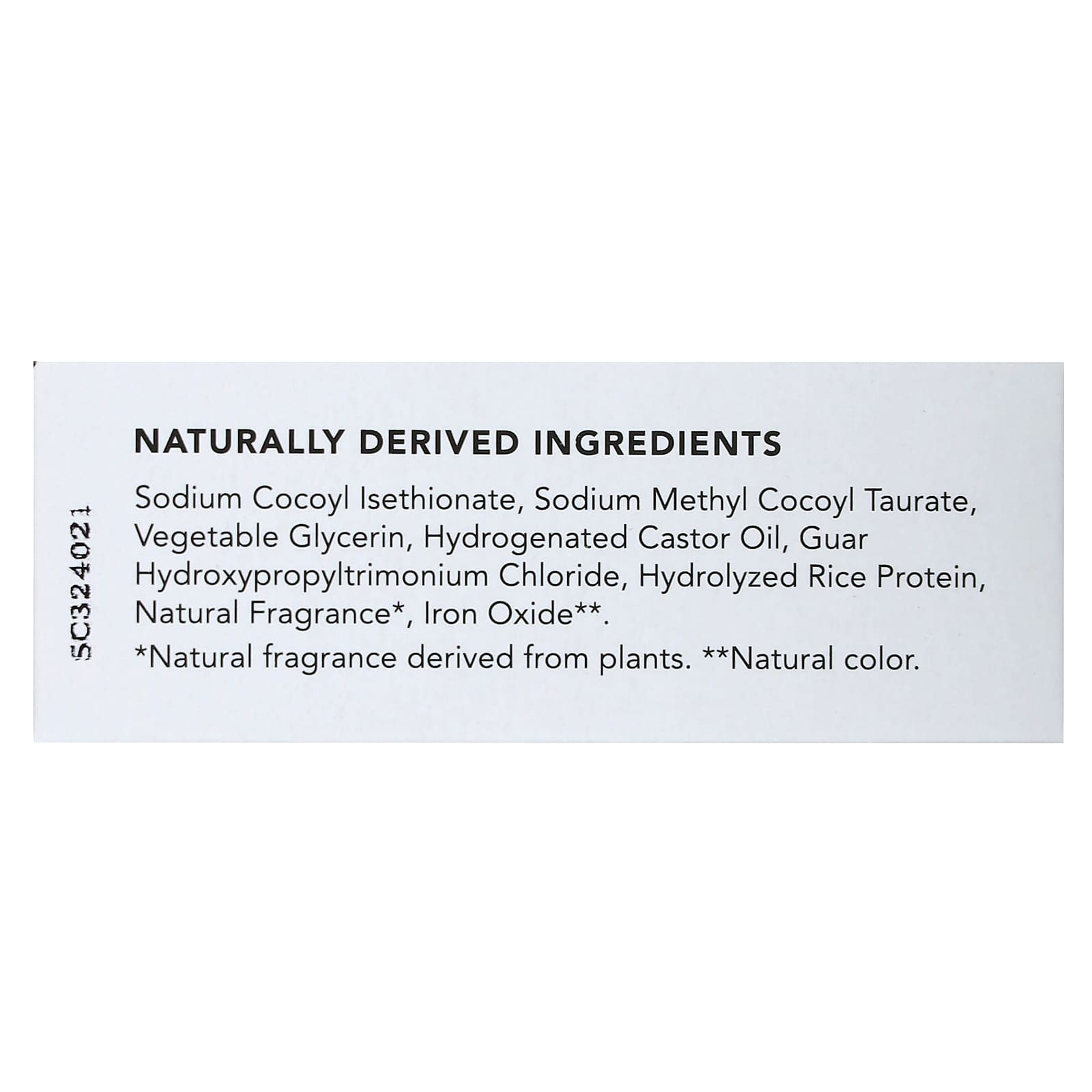 Sodium cocoyl isethionate, sodium methyl cocoyl taurate, glicerina vegetal, óleo de rícino hidrogenado, guar hydroxypropyltrimonium chloride, proteína de arroz hidrolisada, fragrância natural*, óxido de ferro**.