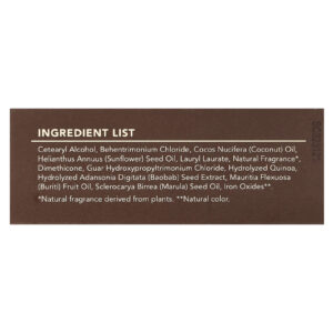 Álcool cetoestearílico, behentrimonium chloride, óleo de Cocos nucifera (coco), óleo da semente de Helianthus annuus (girassol), lauril laurato, fragrância natural*, dimeticona, guar hydroxypropyltrimonium chloride, quinoa hidrolisada, extrato da semente de Adansonia digitata (baobá) hidrolisado, óleo da fruta de Mauritia flexuosa (buriti), óleo da semente de Sclerocarya birrea (marula), óxidos de ferro**.