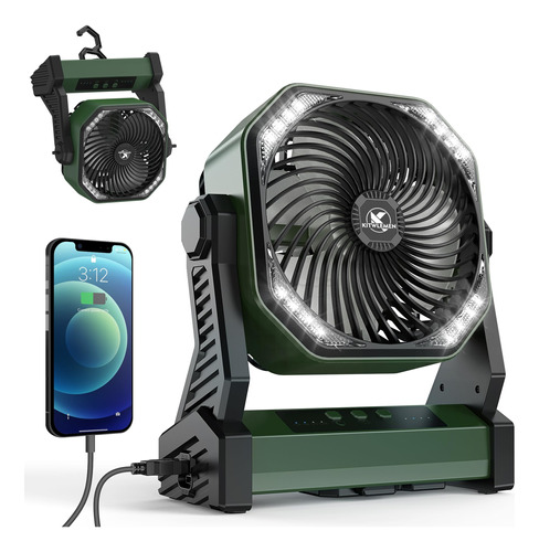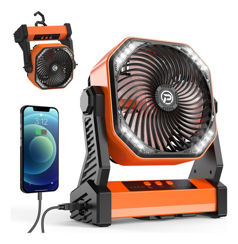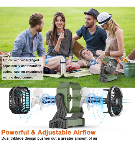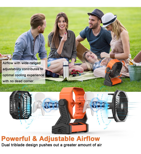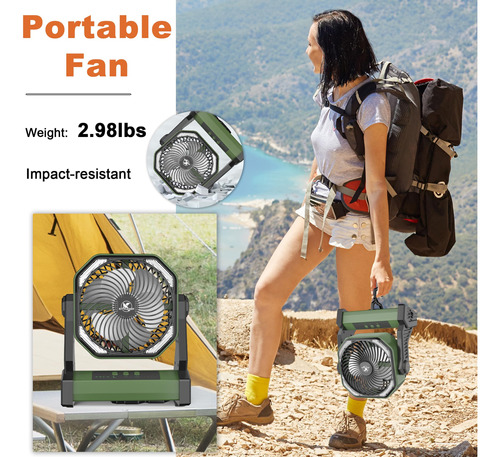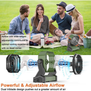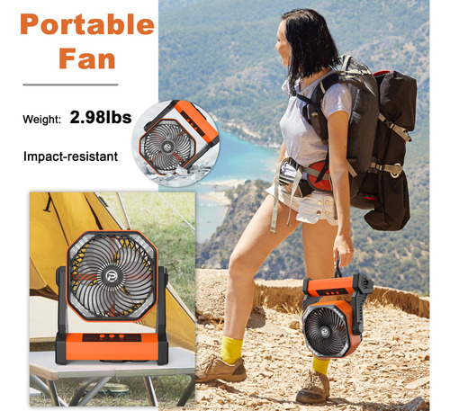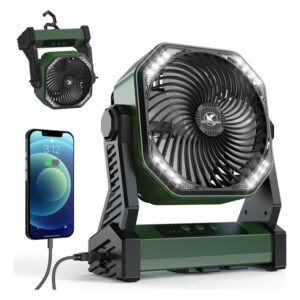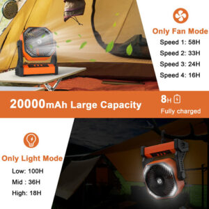 Description: The 20000mAh rechargeable battery operated camping fan and light combo features powerful airflow, light source and hang-ability, provides longevity and convenience to keep you cool on your adventures, and it will help you stay in a better mood. Specifications: Battery Capacity: 20000mAh Rated Power: 15W Type-C Input: 5V-3A Type-C Output: 5V-3A USB Output: 5V-2A Size & Weight: 8.6*4*10.2 inch / 2.98 lbs Features: Run Time for Fan: Speed 158H Speed 233H Speed 324H Speed 416H Run Time & Power for Light: Level 1100H / 0.16W Level 240H / 1W Level 316H / 2.9W About 8 hours of fan and light on the highest setting. Package: Camping Fan*1 Type-C Charging Cord*1 User Manual*1 – 20000mAh RECHARGEABLE BATTERY: Powered by 20000mAh rechargeable battery, it can be fully charged in 8-9 hours with 5V3A input via the including type-C cord, and provide 8-100hours duration. Built-in 5V/3A type-C input/output port and a 5V/2A USB output port for charging the fan conveniently, or use it to power other devices, a good helper for camping trip, power outage, hurricane, etc – SUPER BRIGHT LED LIGHT: Compose of 16 LED light beads with 3 brightness settings, and provides the ideal light source for nighttime outdoor activities, like barbecue, picnic, hiking, fishing, etc – DOUBLE TRIBLADE & 270 PIVOT: The camping fan with double triblade design to put on more powerful airflow than the ordinary others. Plus 4 different speeds to meet your different demands. A 270 pivoting head enables to cool you down instantly in whichever direction you like – EASY TO USE: The fan and LED light are controlled separately. 4 speed indicators and 4 battery indicators show you current fan speed setting and the remaining battery capacity. Press the sleep mode button to turn off the indicators when you sleep and dont want it on. A 360 rota-table and fold-able hook at the bottom for hanging the tent fan anywhere you want to – STURDY & ANTI-DROP: Made of sturdy ABS material for anti-drop and anti-collision use, and the ultra-stable base keeps fan firmly in place even when working on the highest speed, perfect use for different outdoor occasions. It is also suitable for indoor use as a desk fan when studying, working, reading, etc – Please note: Adapter not included