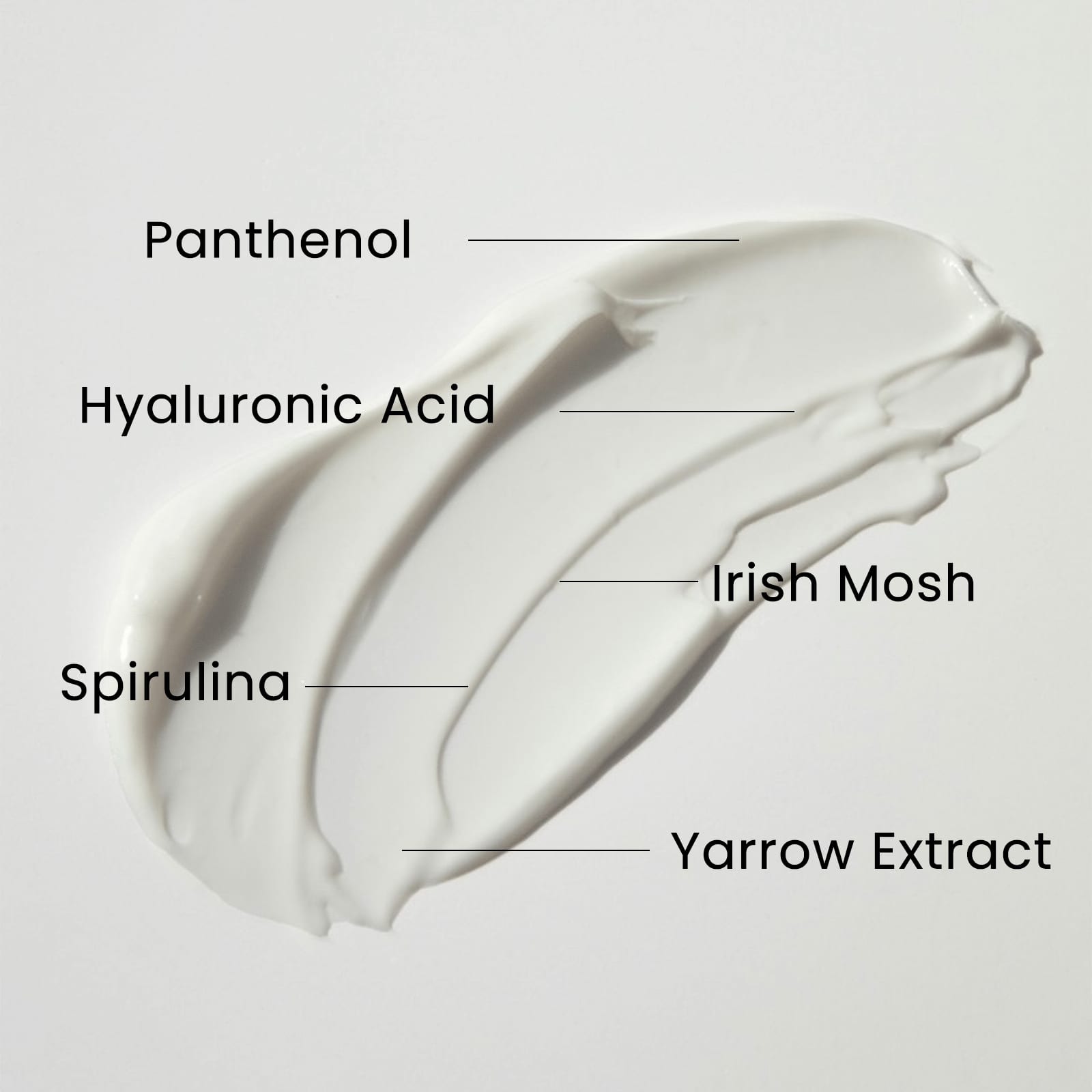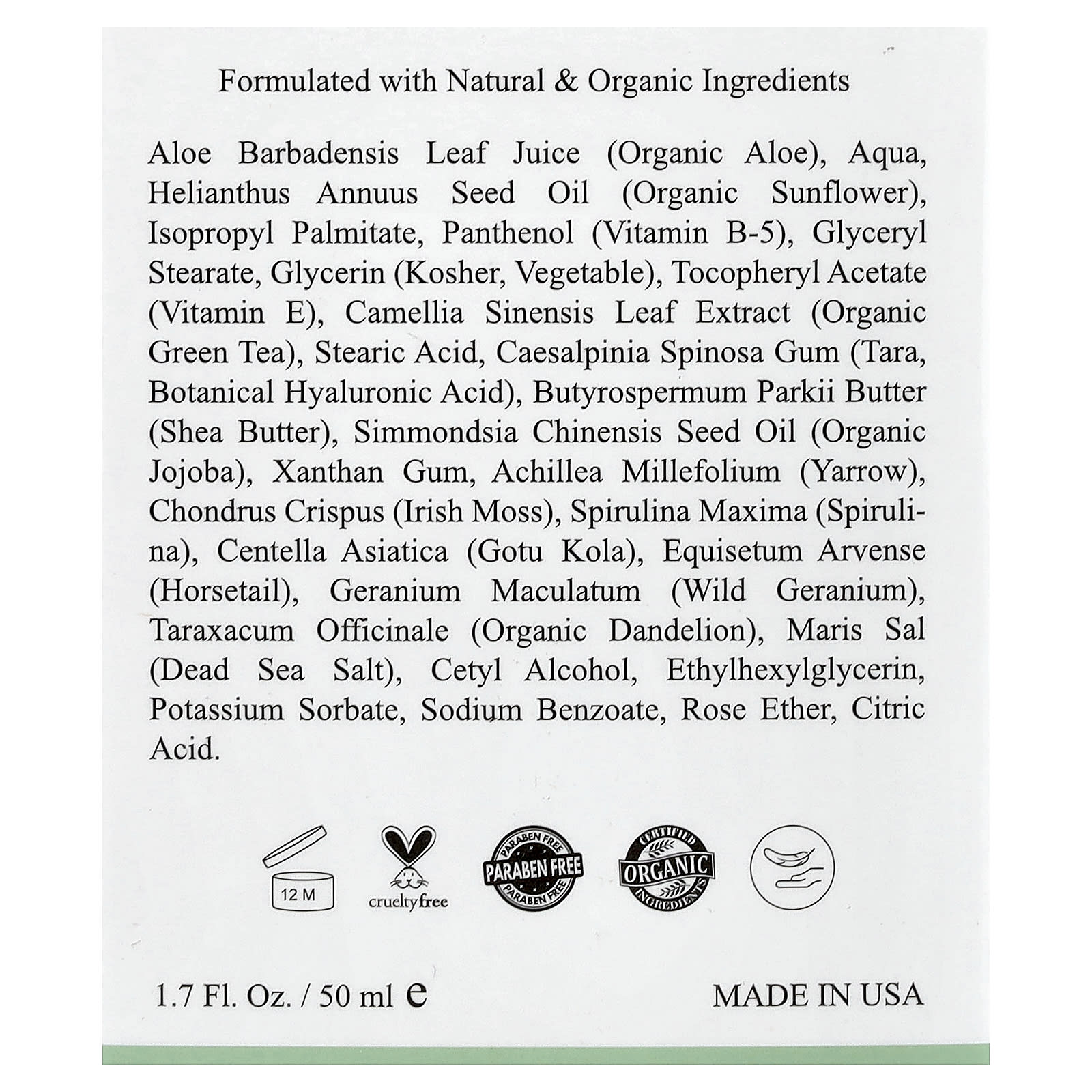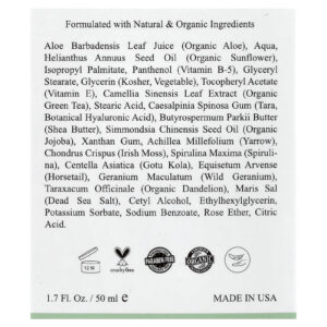 Suco da folha de Aloe barbadensis (aloe orgânica), aqua, óleo da semente de Helianthus annuus (girassol orgânico), palmitato de isopropila, pantenol (vitamina B-5), monoestearato de glicerila, glicerina (kosher, vegetal), acetato de racealfatocoferol (vitamina E), extrato da folha de Camellia sinensis (chá verde orgânico), ácido esteárico, goma de Caesalpinia spinosa (tara, ácido hialurônico botânico), manteiga de Butyrospermum parkii (manteiga de karité), óleo da semente de Simmondsia chinensis (jojoba orgânica), goma xantana, Achillea millefolium (milefólio), Chondrus crispus (musgo-da-irlanda), Spirulina máxima (spirulina), Centella asiatica (gotu kola), Equisetum arvense (cavalinha), Geranium maculatum (gerânio selvagem), Taraxacum officinale (dente-de-leão orgânico), maris sal (sal do mar morto), álcool cetílico, ethylhexylglycerin, sorbato de potássio, benzoato de sódio, éter rosa, ácido cítrico.