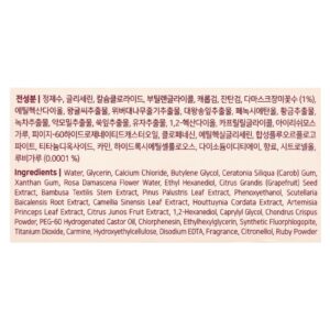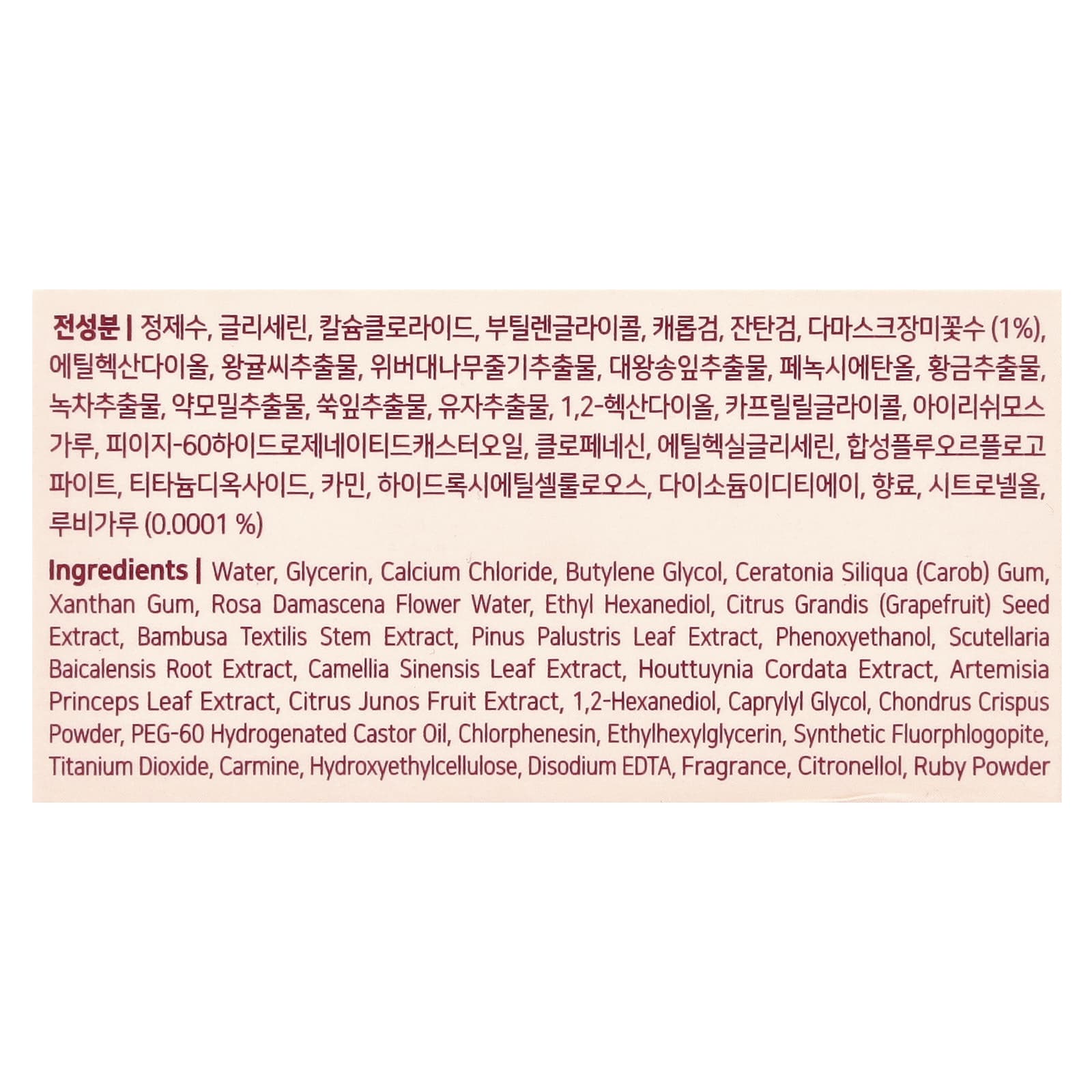 Água, glicerina, cloreto de cálcio, butilenoglicol, goma de Ceratonia siliqua (alfarroba), goma xantana, água da flor de Rosa damascena, ethyl hexanediol, extrato da semente de Citrus grandis (toranja), extrato do caule de Bambusa textilis, extrato da folha de Pinus palustris, fenoxietanol, extrato da raiz de Scutellaria baicalensis, extrato da folha de Camellia sinensis, extrato de Houttuynia cordata, extrato da folha de Artemisia princeps, extrato da fruta de Citrus junos, 1,2-hexanediol, caprylyl glycol, pó de Chondrus crispus, óleo de rícino hidrogenado peg-60, clorfenesina, ethylhexylglycerin, synthetic fluorphlogopite, dióxido de titânio, carmim, hietelose, edetato dissódico, fragrância, citronelol, pó de rubi.