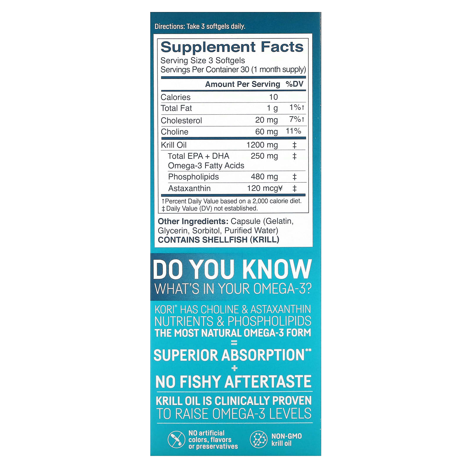 KORI® contém colina, nutrientes e fosfolipídios de astaxantina.
