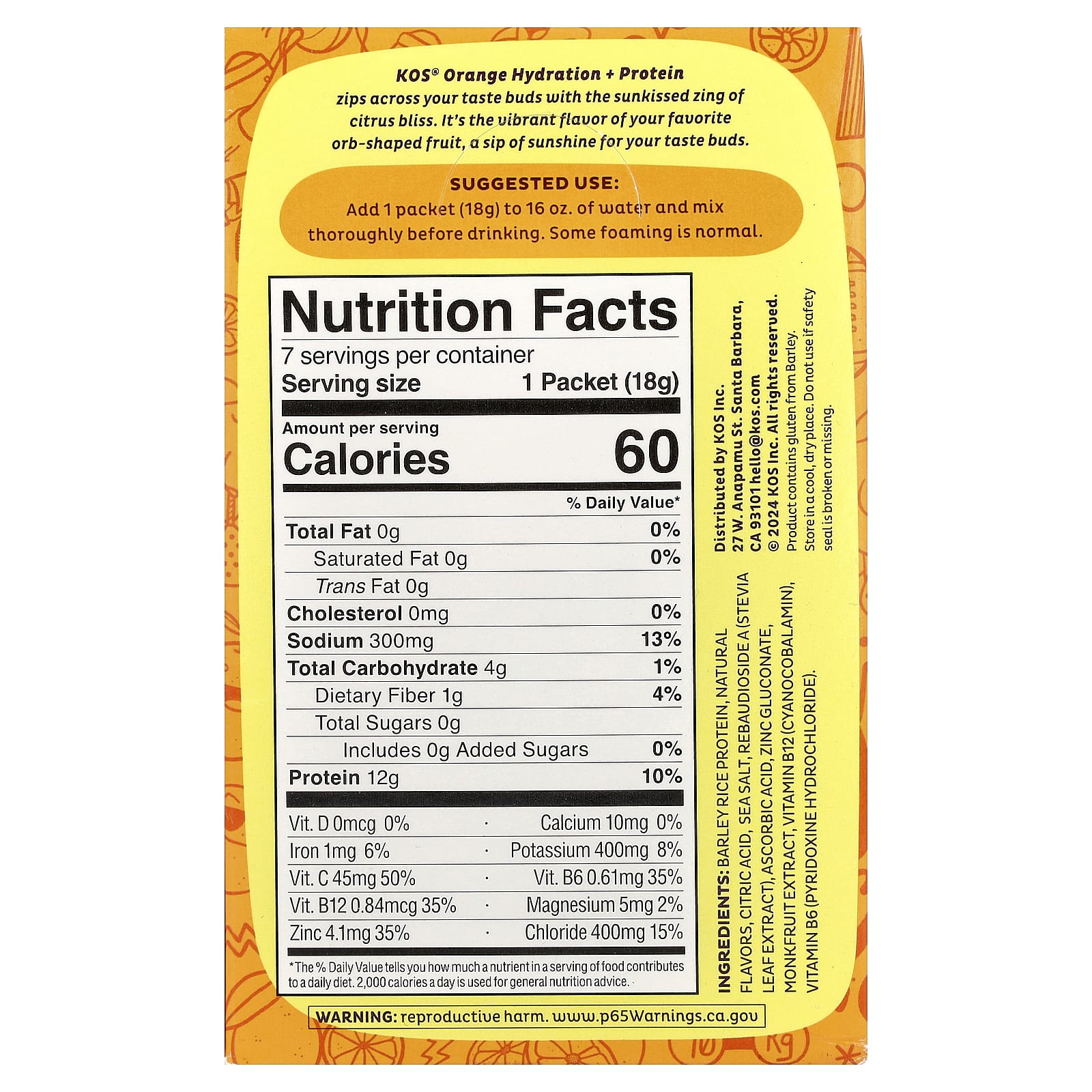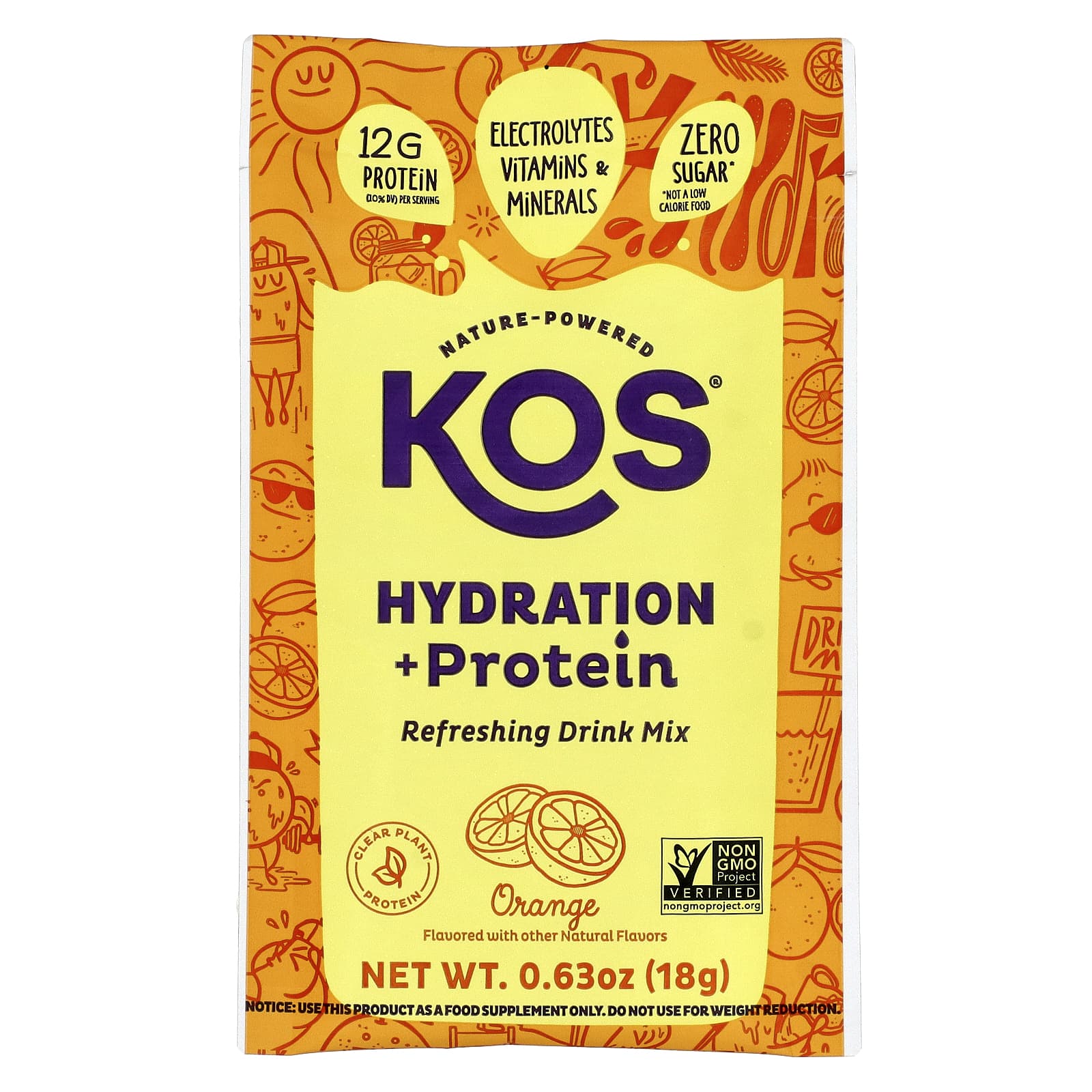 KOS Hidratação + Proteína Mistura para Bebida Refrescante Laranja 7 Embalagens 18 g (065 oz) Cada – KOS Nutrição Esportiva Hidratação e Eletrólitos Proteína Proteína Vegetal.
