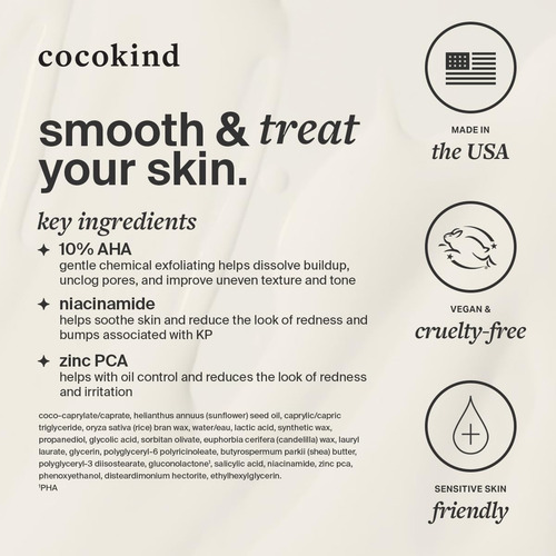 Este stick de tratamento KP à prova de bagunça com 10% de AHA esfolia suavemente para suavizar a textura áspera e irregular e reduzir a aparência de descoloração associada à queratose pilar. O aplicador inovador e o acabamento leve e não pegajoso facilitam o tratamento de inchaços KP, pêlos encravados e pele opaca e escamosa em casa ou em qualquer lugar. A fórmula sem perfume foi testada clinicamente para peles sensíveis. – BASTÃO SUAVIZANTE PARA QUERATOSE PILAR: este bastão de tratamento KP à prova de bagunça com 10% de AHA esfolia suavemente para suavizar a textura áspera e irregular e reduzir a aparência de descoloração associada à queratose pilar. O aplicador inovador e o acabamento leve e não pegajoso facilitam o tratamento de inchaços KP, pêlos encravados e pele opaca e escamosa em casa ou em qualquer lugar. – INGREDIENTES PRINCIPAIS: 10% AHA – O esfoliante químico suave ajuda a dissolver o acúmulo, desobstruir os poros e melhorar a textura e o tom irregulares. Niacinamida – ajuda a acalmar a pele e reduzir a aparência de vermelhidão e inchaços associados ao KP. Zinco PCA – ajuda no controle da oleosidade e reduz a aparência de vermelhidão e irritação. – Adequado para peles sensíveis: a fórmula do esfoliante corporal KP bump, sem perfume, foi testada clinicamente para peles sensíveis. – COMO USAR: Antes da primeira utilização, solte a tampa protetora interna e descarte-a. Para aplicar, deslize o bastão na pele limpa e seca do corpo, visando áreas ásperas e irregulares. Use de manhã ou à noite, 2 a 3 vezes por semana. – COCOKIND: produtos para a pele que são ecologicamente corretos sem comprometer a formulação. Nossos produtos têm como objetivo cumprir suavemente a função que prometem, bem como hidratar e apoiar a barreira da pele, o que acreditamos que leva a uma pele brilhante e feliz. DURADOURO: A maioria dos nossos produtos tem uma vida útil de cerca de 12 meses após a abertura. Na parte inferior de cada caixa de produto, listamos um símbolo POA (período após a abertura). Deve parecer um pequeno frasco aberto com um número e a letra M (meses). Isso ajudará você a determinar por quanto tempo cada produto é válido após a abertura.