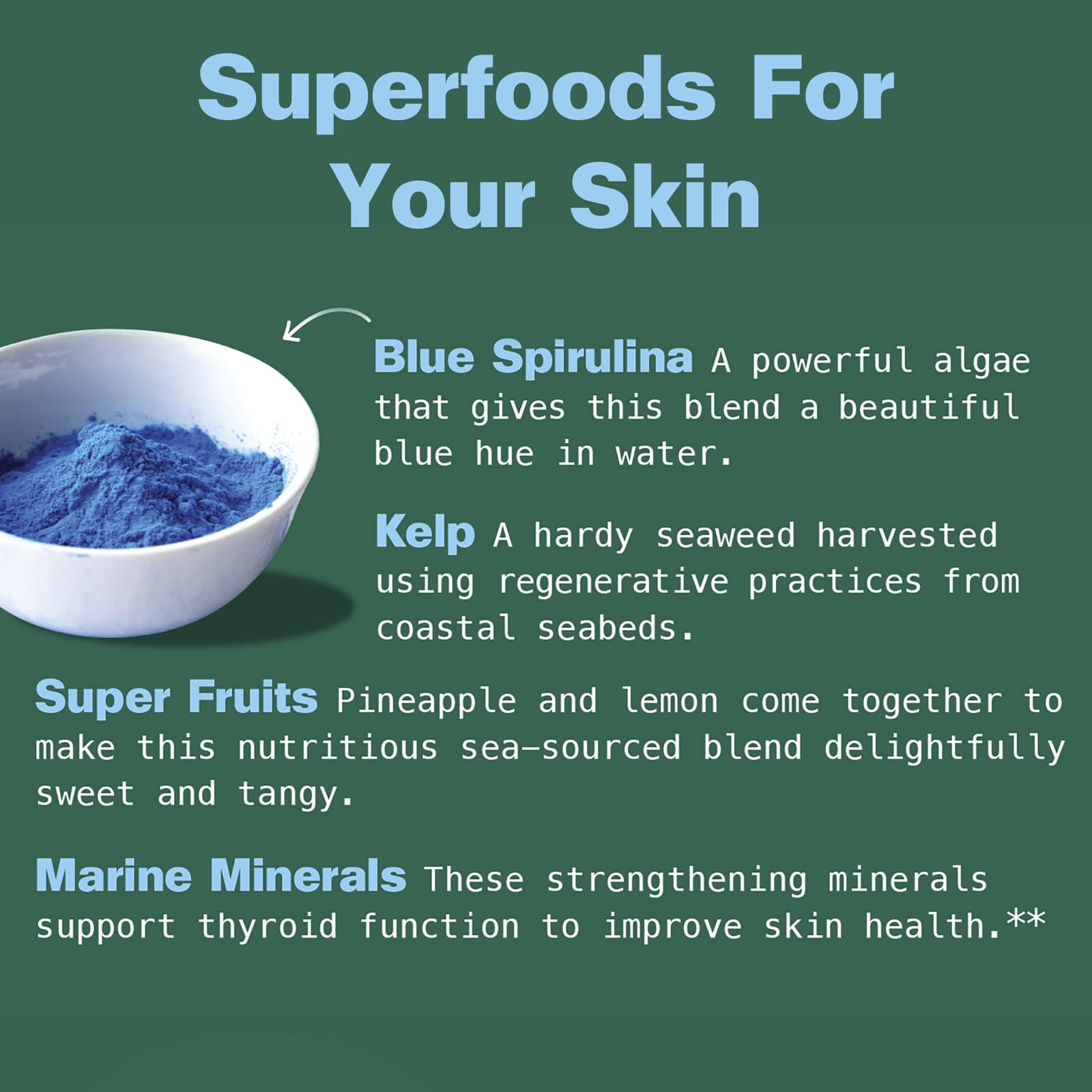 Marine Glow deixa você brilhar com uma mistura cuidadosamente elaborada de frutas tropicais, algas marinhas colhidas de forma sustentável e especiarias equilibrantes. Uma única dose fornece 100% do Iodo Diário para manter você radiante de dentro para fora.