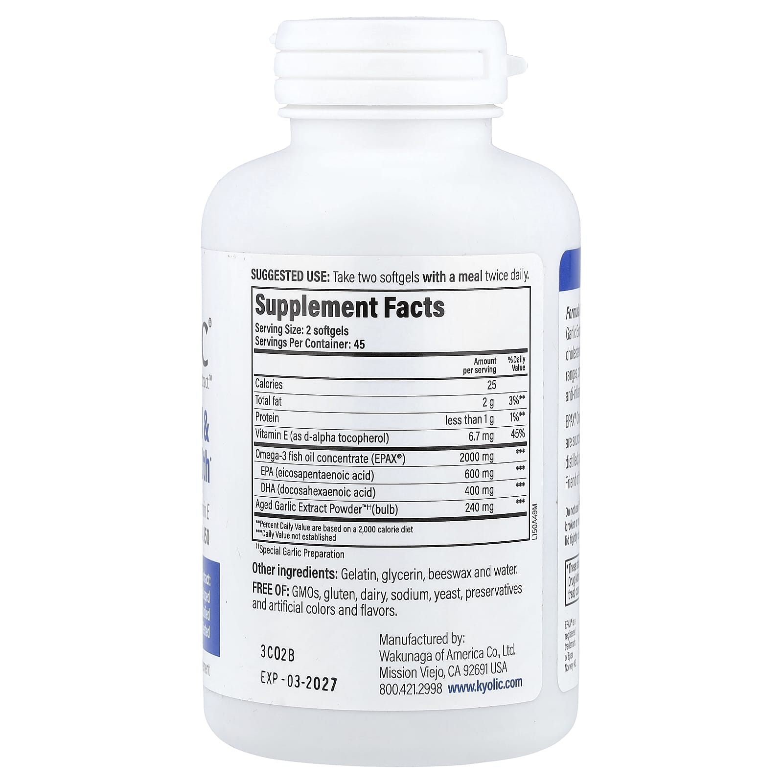 A Fórmula 150 combina Kyolic® Aged Garlic Extract™ inodoro, Ômega-3 e Vitamina E para manter o colesterol e os triglicerídeos dentro dos limites normais, além de contribuir para a circulação e a resposta anti-inflamatória natural do corpo.